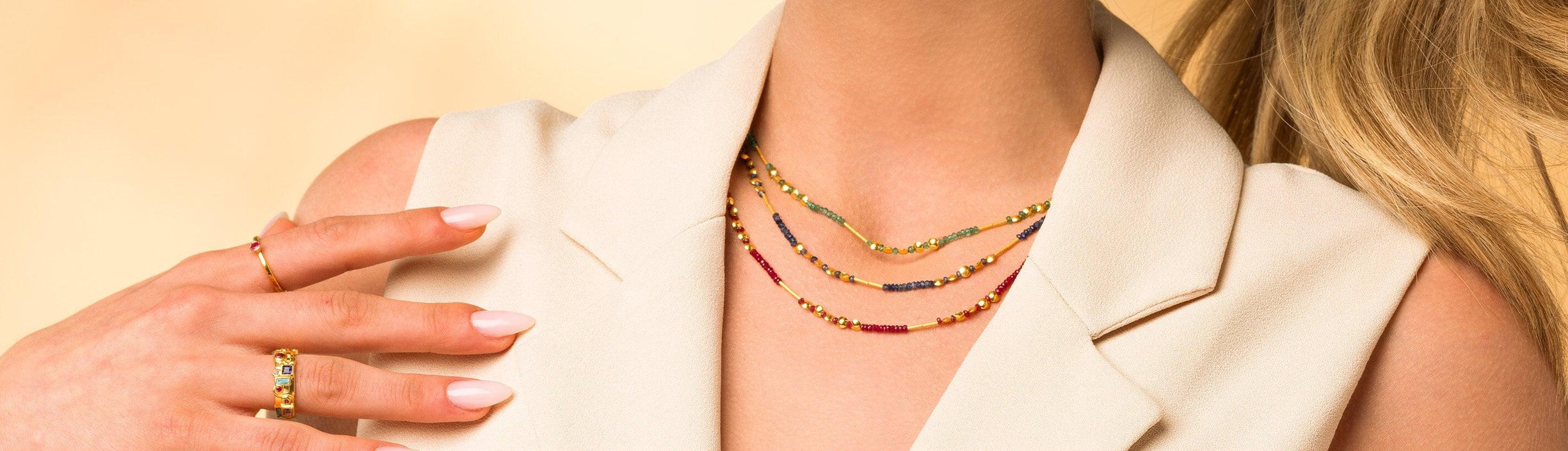 Bridesmaids are loving the flexibility in their attire and accessories, moving away from uniform looks to more personalized styles. Layered necklaces and bracelets in 24k gold are go-to pieces for a touch of brilliance without overshadowing the bride. These pieces blend simplicity and sophistication beautifully, making them ideal for bridesmaids. Check out our Geo Collection for delicate handcrafted 24k gold chains, and the Rain Collection for single-strand necklaces with dainty gemstone beads like ruby, sapphire, black diamond, or emerald.
