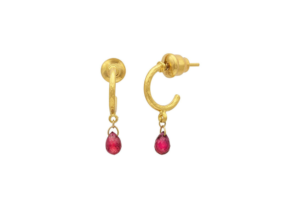 GURHAN Dew Gold Huggie Hoop Earrings, Thin Round On Post, With Ruby Briolette