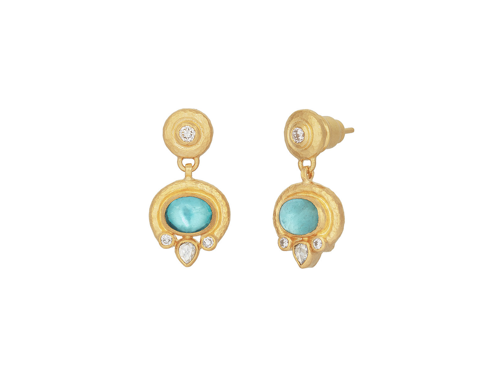 Experience the epitome of elegance with our Muse Collection 24k Gold Earrings. Crafted with precision, each piece is a masterpiece, featuring a captivating 8x6mm oval cabochon apatite and a symphony of shimmering diamonds. Indulge in luxury with our one-of-a-kind, single drop silhouette, adorned with rose cut and brilliant cut diamonds, culminating in a wide frame of opulence. Elevate your style effortlessly with these timeless treasures from GURHAN.