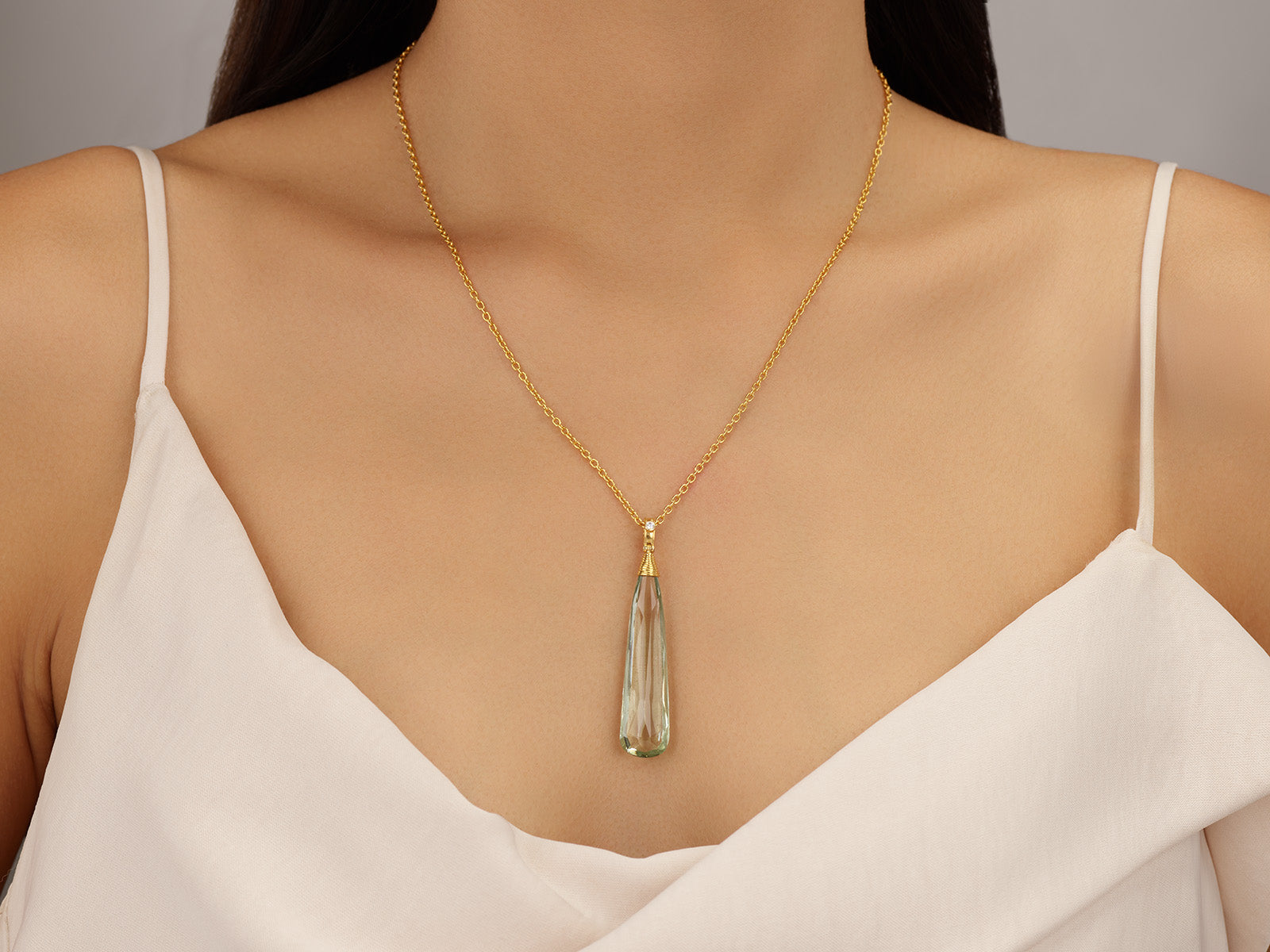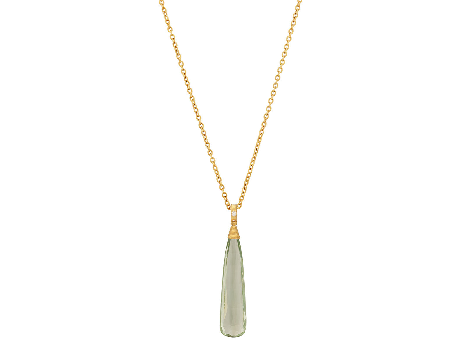From the Crown collection, this one of a kind pendant showcases a 45 × 11 mm mint quartz briolette, glowing with a serene translucence. Sculpted in luminous 24K gold, a hand-coiled cap crowns the stone, while a brilliant-cut white diamond set in an 18K gold detachable hinged bale adds a refined accent of light.