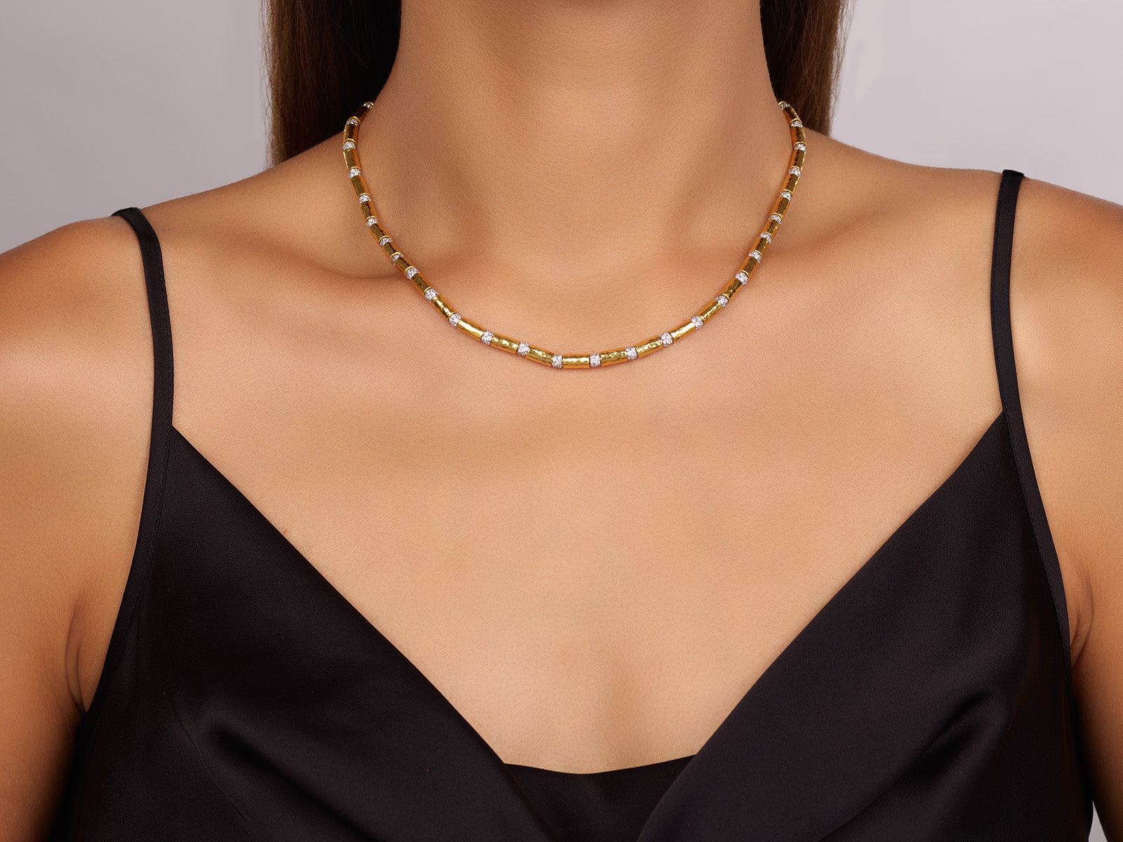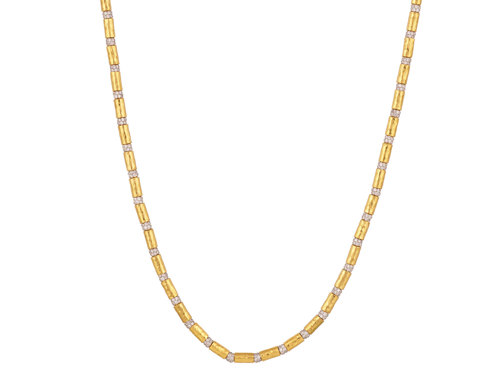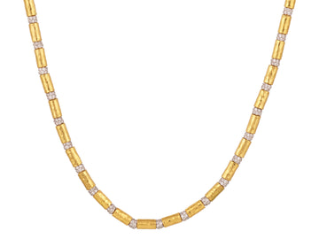 A luminous expression of modern artistry, this Vertigo necklace pairs 24K gold gale tubes with pave stations of brilliant-cut white diamonds set in 18K white gold. Finished with a diamond-accented clasp, the 16.25" strand glimmers with 4.25 carats of radiance, balancing bold design with refined elegance.