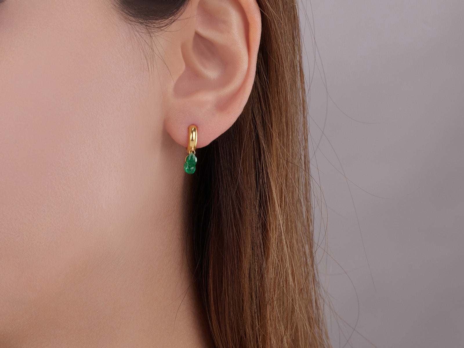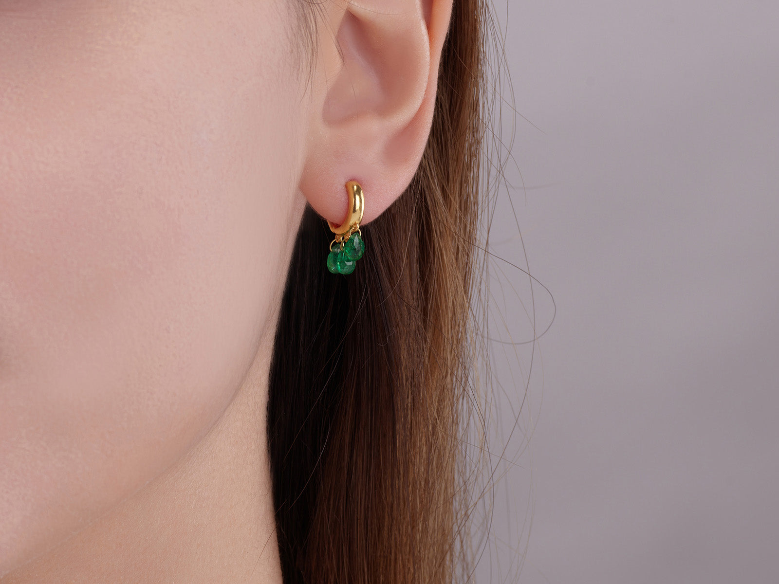 Glistening with rare vibrance, these one of a kind 22K gold huggies from the Dew Collection feature triple drops of faceted emerald briolettes totaling 1.40 carats. Their luminous movement captures the essence of dew kissed by morning light, creating a refined balance of craftsmanship and natural allure.
