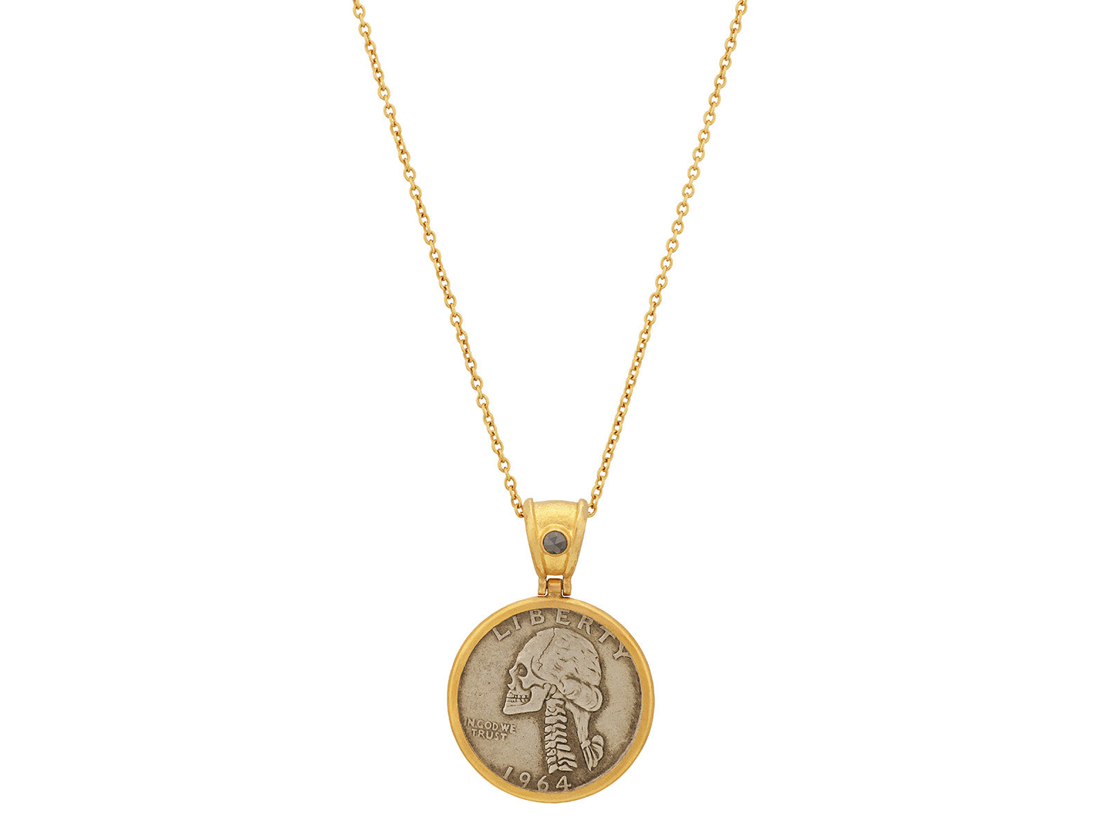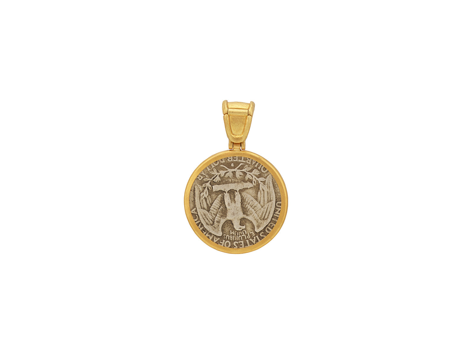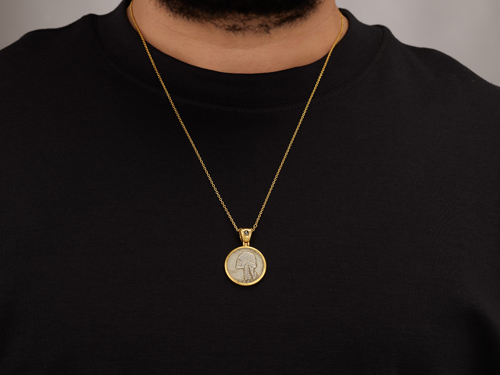A singular expression of strength and heritage, this one of a kind pendant pairs a 24K gold frame with a 24mm round silver coin of sculptural presence. A rose-cut black diamond, set on an 18K gold detachable bale, adds a refined contrast—crafted as a modern emblem of masculine elegance.