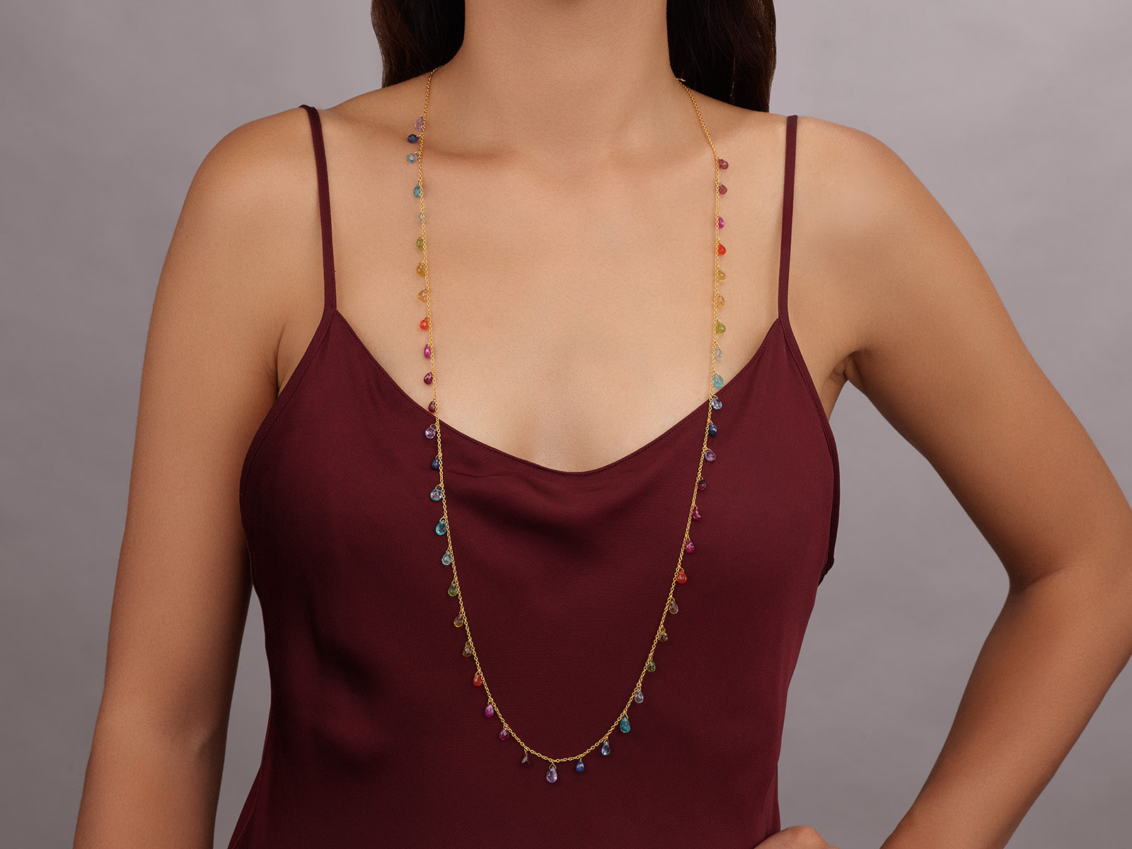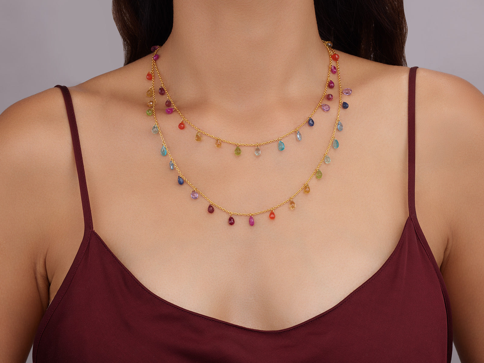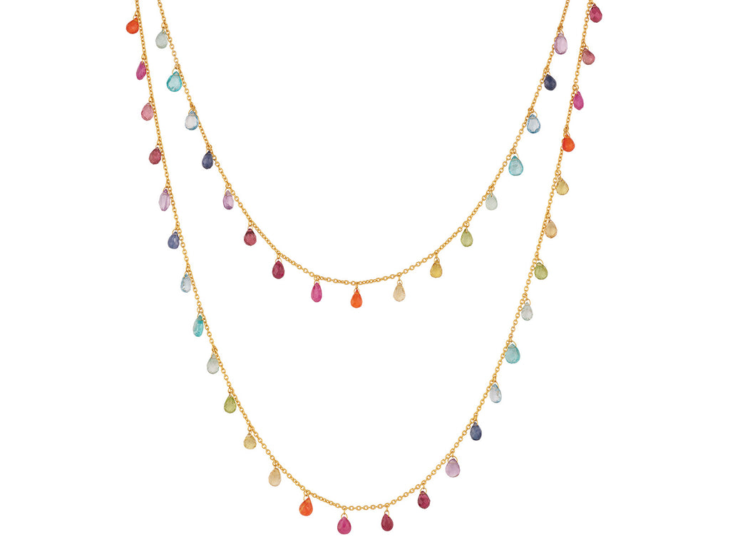 A cascade of vibrant briolettes—amethyst, sapphire, ruby, topaz, emerald, and more—gathers along a 22K gold charm, each gem chosen for its luminosity. Suspended from a 36.25" solid gold chain, this one of a kind Dew necklace brings color, movement, and refined artistry together in a radiant, singular composition.