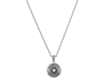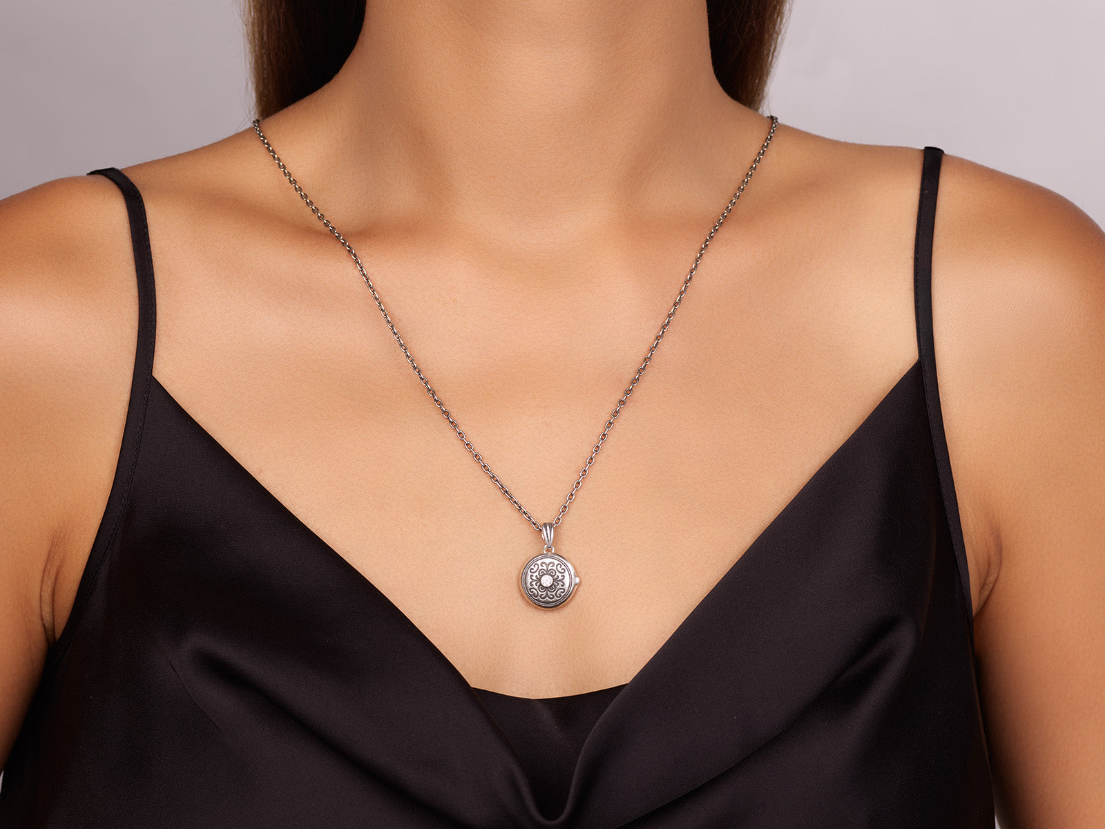 Crafted in sterling silver, this elegant locket pendant necklace features a delicate floral design accented with a brilliant-cut white diamond (0.11 ctw). Suspended from a detachable bale on a 24" silver chain with a handmade rolling lobster clasp, it blends artistry with timeless sophistication.