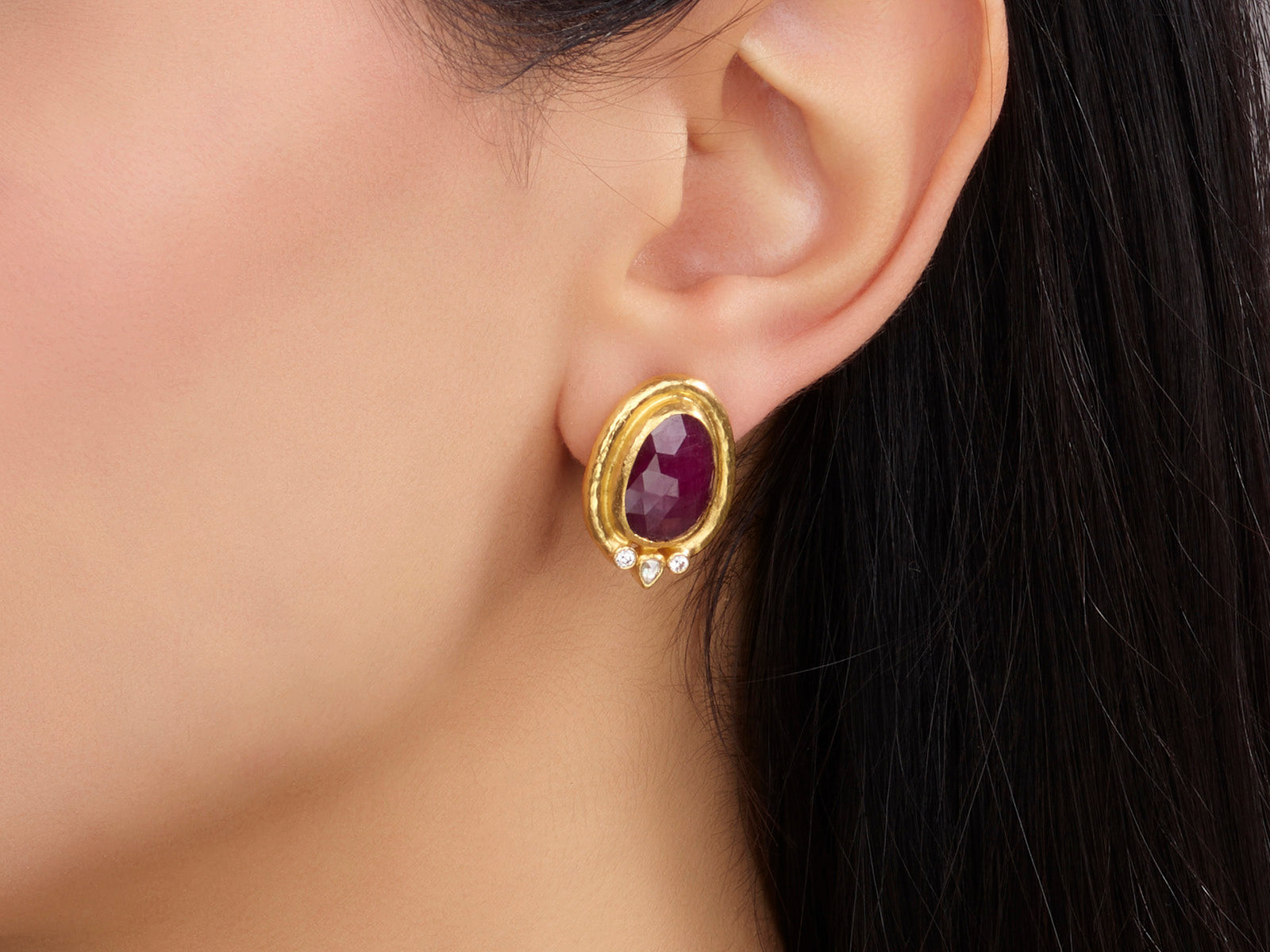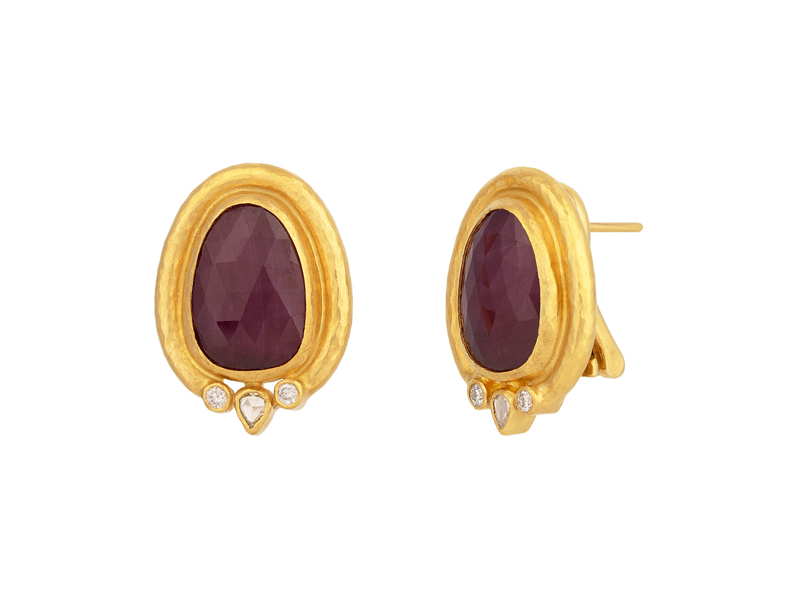 GURHAN Muse One-of-a-Kind 24K Gold Ruby Stud Earrings, 15x11mm Amorphous Gemstone set in Wide Frame