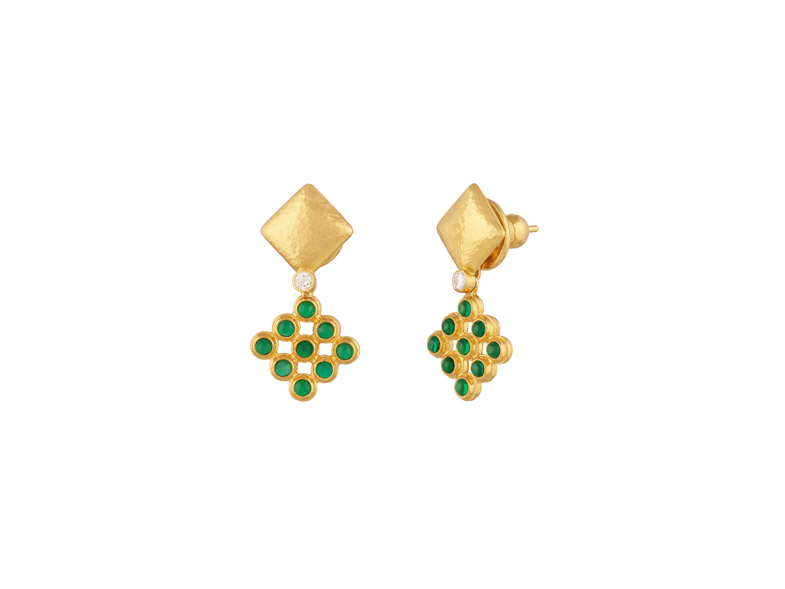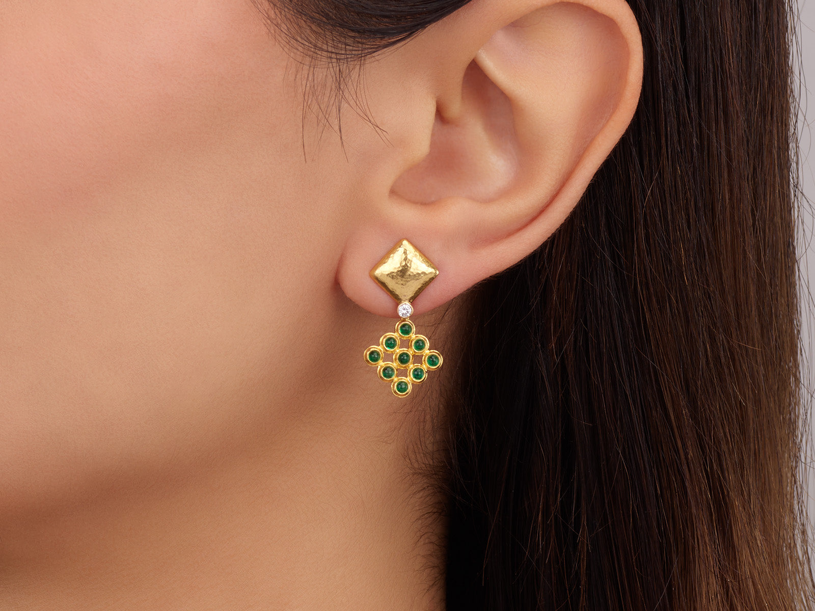 A cascade of verdant cabochon emeralds forms a delicate Pointelle silhouette, suspended beneath a sculpted 22K gold half-square top accented by a brilliant white diamond. Finished with an 18K gold post and vermeil push backs, these earrings balance radiance and refinement in a luminous, elongated drop.