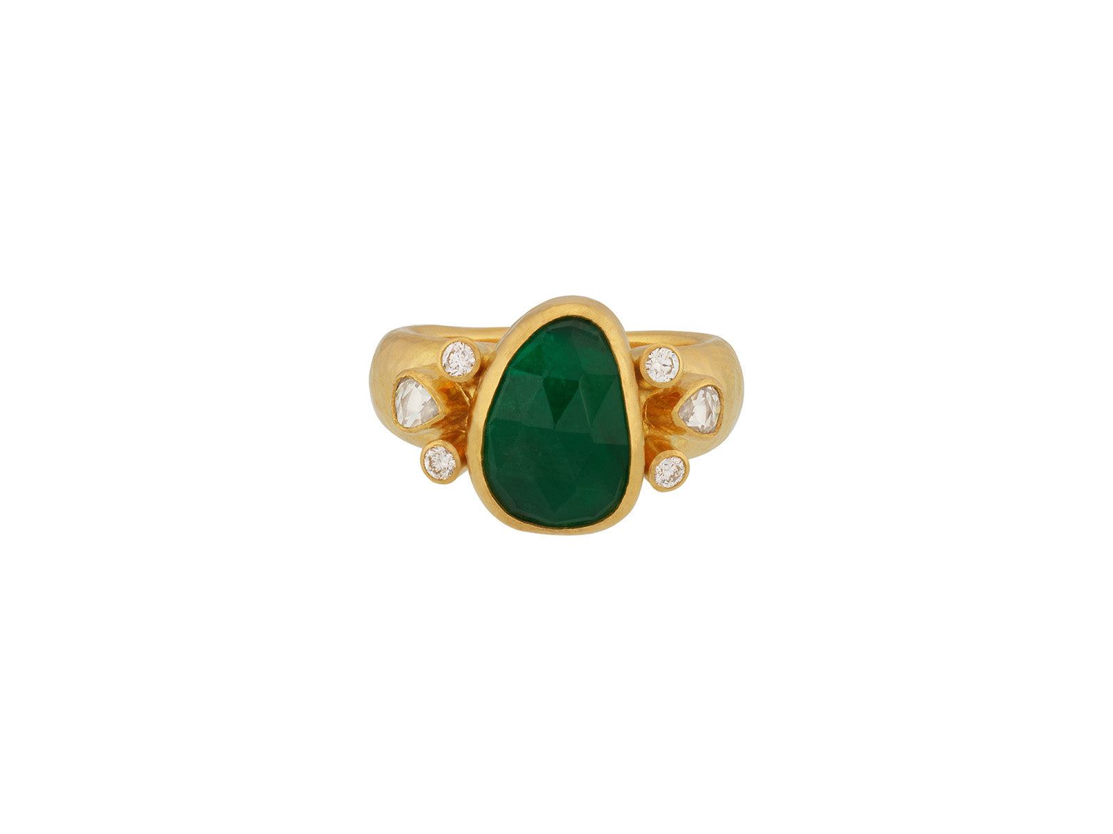 A one of a kind statement in 24K gold, this Elements ring centers a 13 × 10 mm amorphous rose-cut emerald, vertically set for sculptural presence. Drop rose-cut and brilliant white diamonds add refined light, while the graduated shank completes the composition with quiet strength and balance.