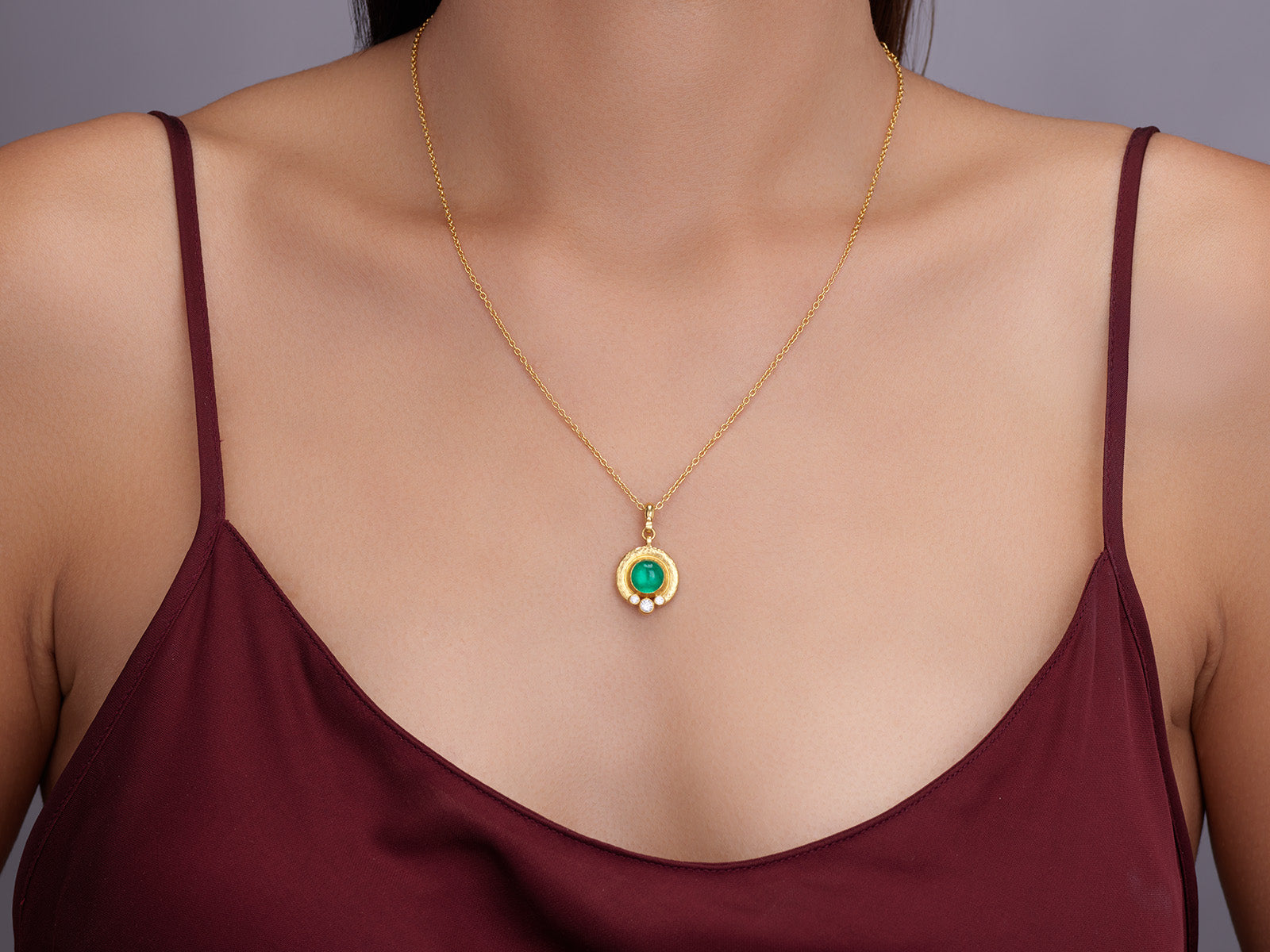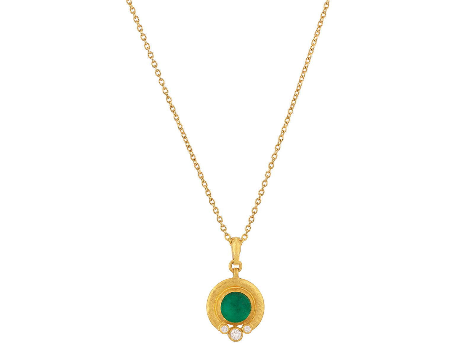A luminous 8mm cabochon emerald anchors this one of a kind Muse necklace, set in a wide hand-crafted 24K gold frame accented with brilliant white diamonds. A detachable 18K bale offers versatility, while the 22K solid chain completes the piece with refined elegance. A radiant expression of GURHAN’s artistry.