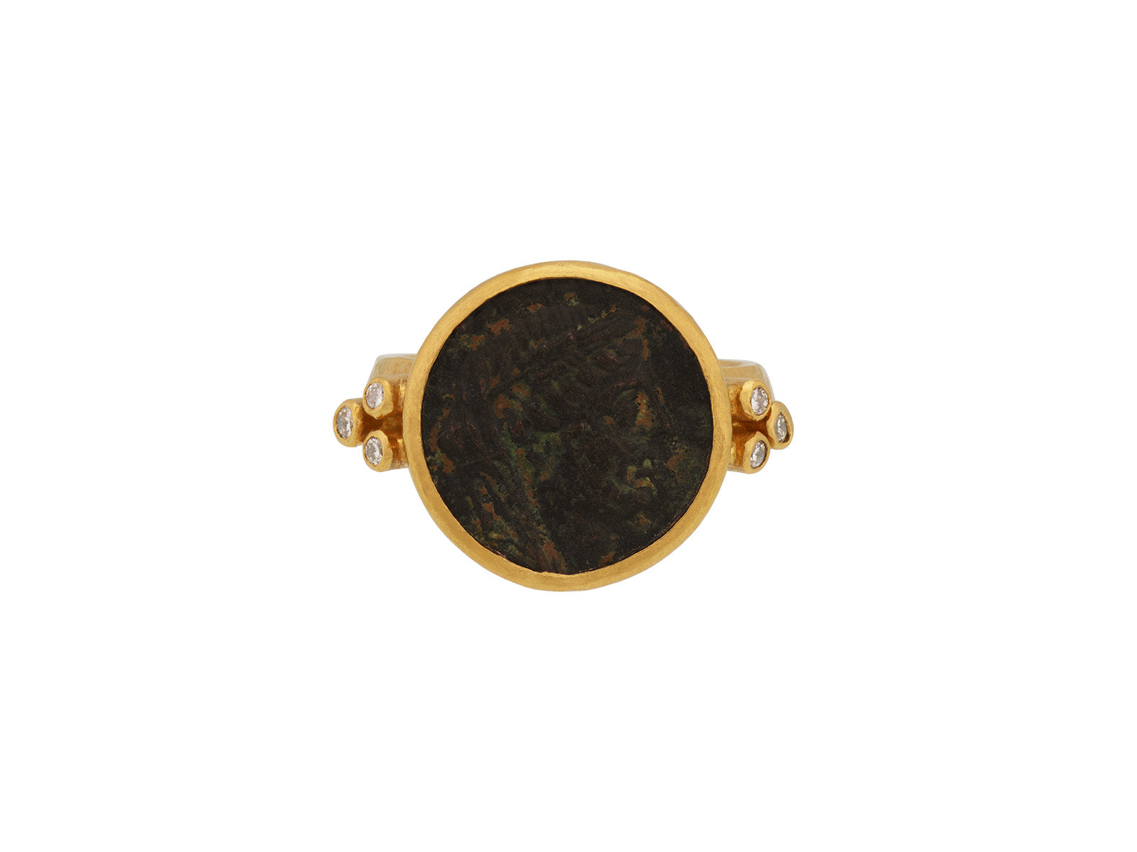 A rare Roman Imperial coin takes center stage in this one of a kind Antiquities ring, framed in rich 24K gold and accented with brilliant-cut white diamonds. Set on a refined, graduated shank, the piece blends ancient history with modern elegance—an heirloom of character, crafted to endure. Size 6.5.