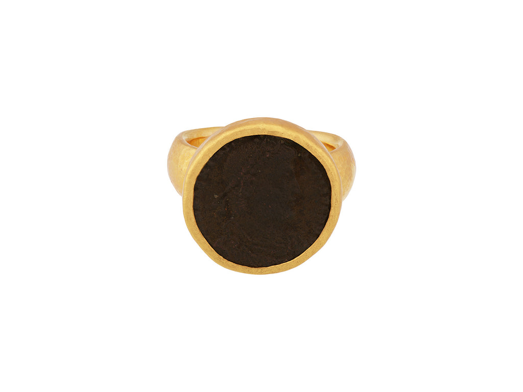 A rare Roman Imperial coin becomes the centerpiece of this one of a kind 24K gold ring. Framed in rich, hand-worked gold and set on a graduated shank, its 16 mm artifact radiates historic depth and quiet grandeur. A timeless fusion of antiquity and craftsmanship, designed for those who appreciate objects with a story. Size 6.5.