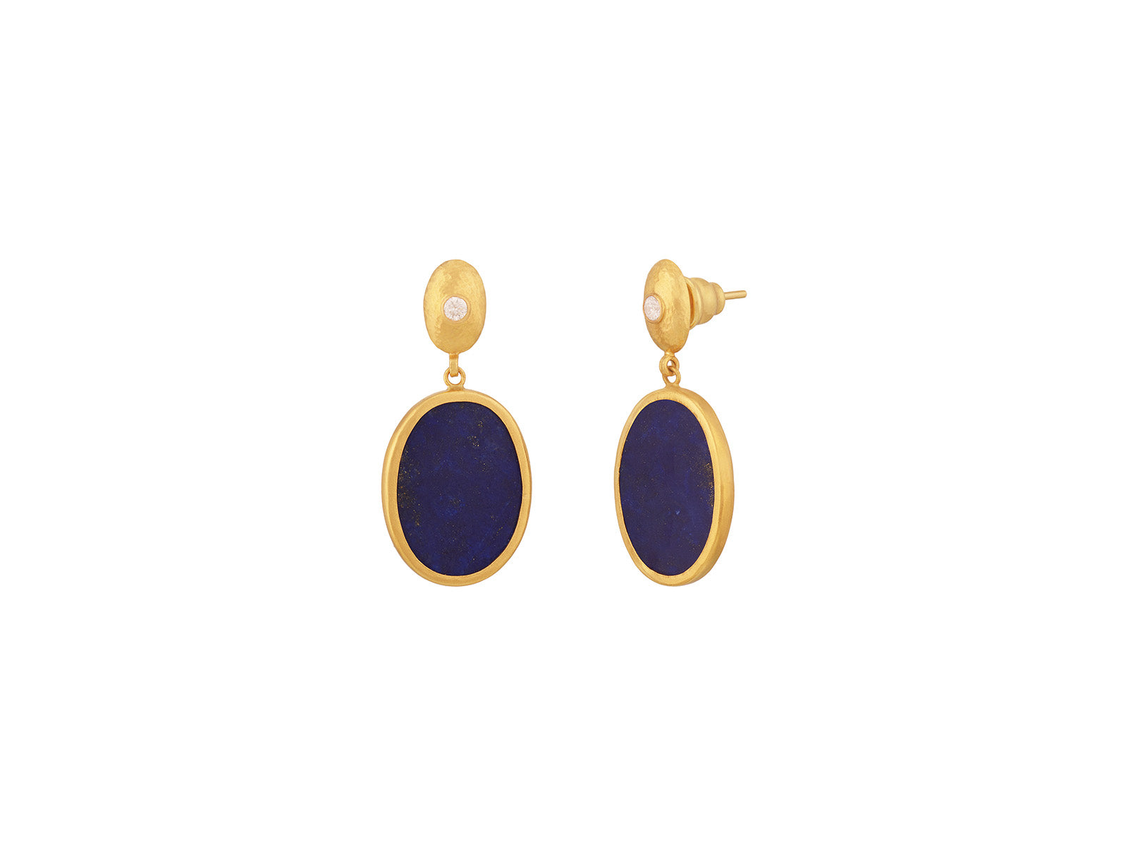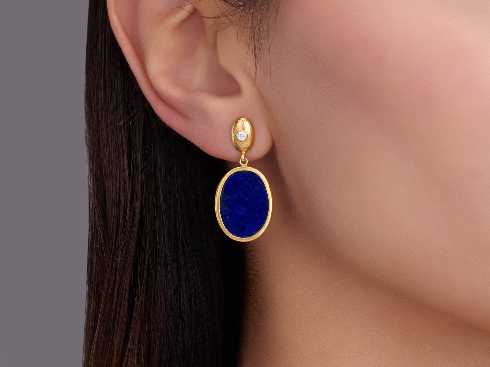 A luminous ode to the Rune collection, these single-drop earrings pair a 20x15mm flat oval lapis with a refined 22K half-lentil top accented by brilliant white diamonds. Set in warm 24K gold with an 18K post, the design balances vivid color and elegant form, creating a sophisticated statement with timeless presence.