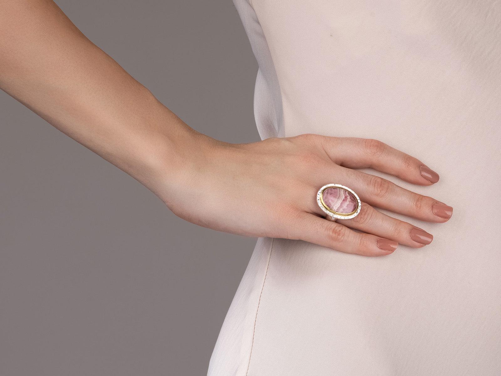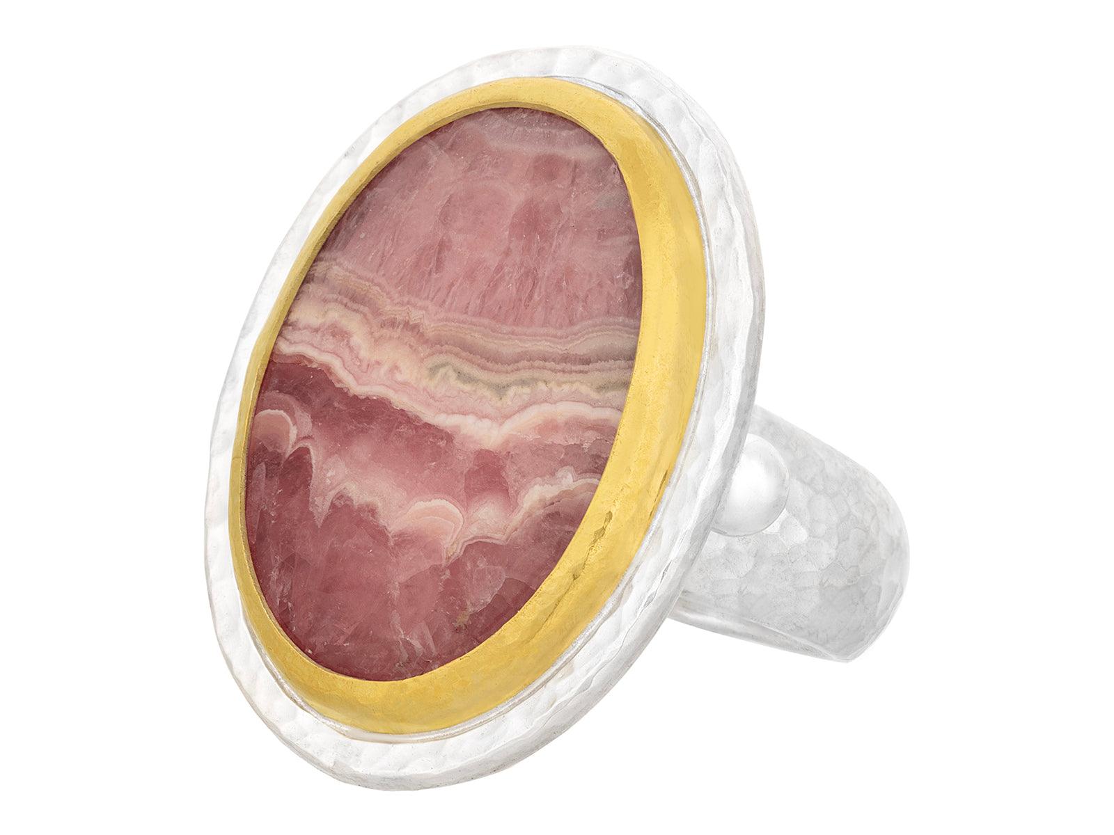 GURHAN Galapagos Sterling Silver Rhodochrosite Cocktail Ring, 25x18mm Oval, Gold Accents