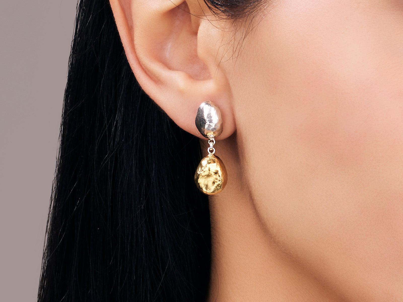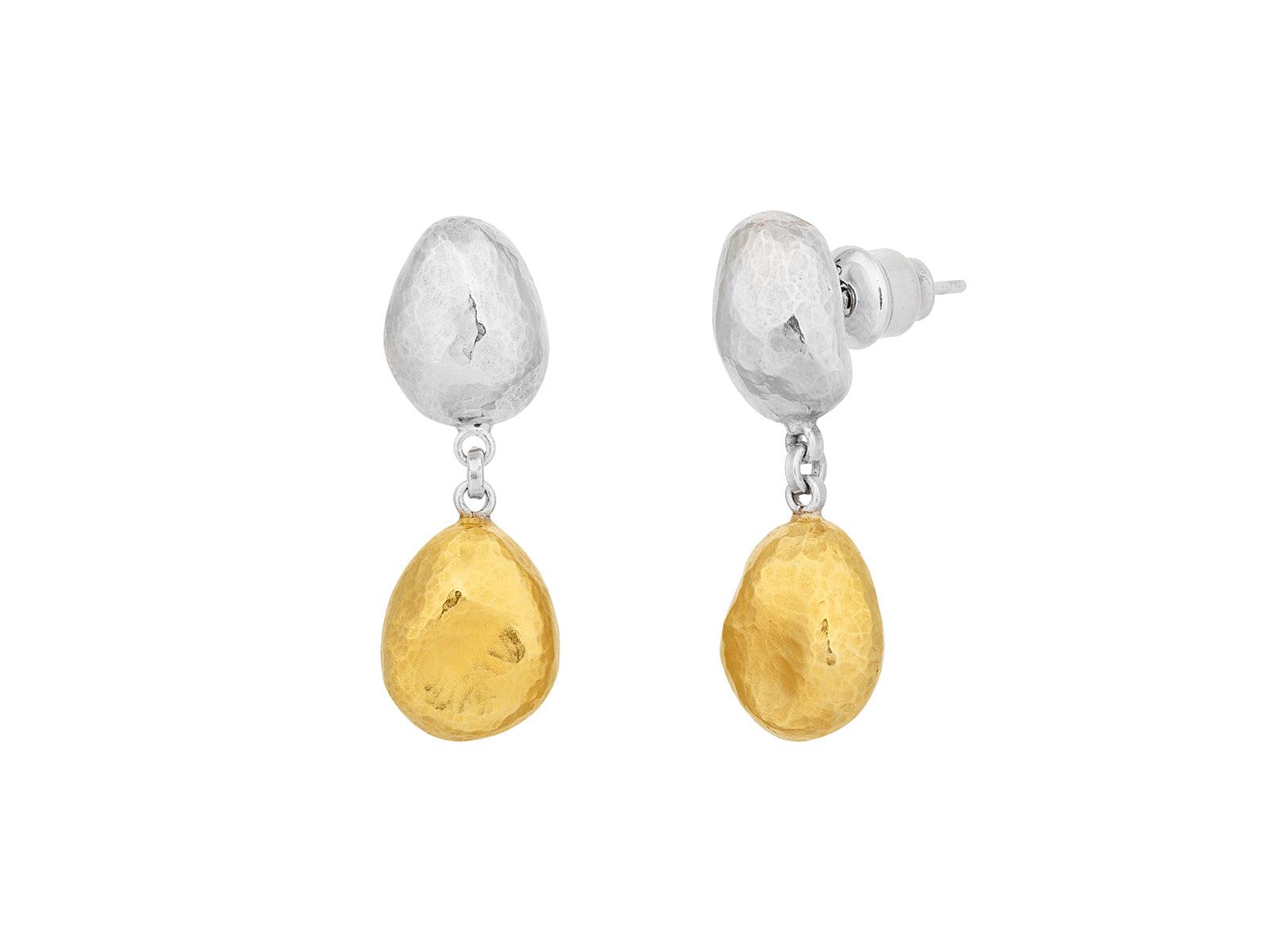 GURHAN Spell Sterling Silver Single Drop Earrings, Double Nugget Shapes on Post Top, Gold Accents