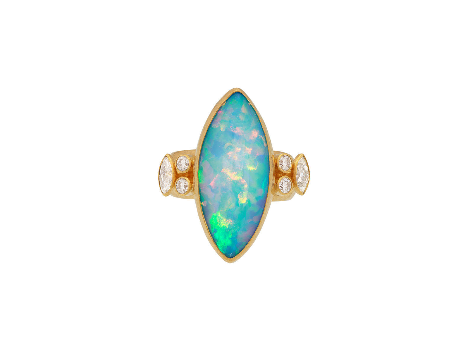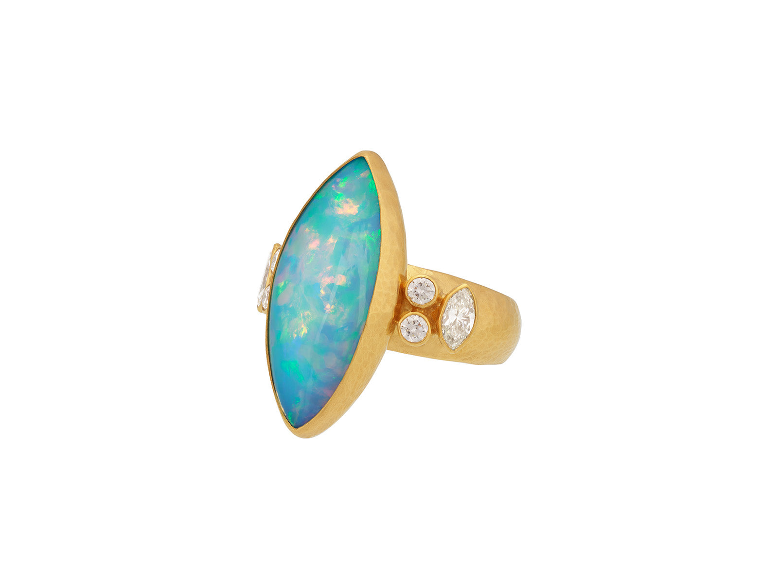 A singular expression of the Rune Collection, this one of a kind ring is crafted in luminous 24K gold. A 30×14 mm marquise cabochon Ethiopian opal rises in a vertical setting, framed by mixed-shape white diamonds (1.38 ctw). The large, graduated shank lends sculptural presence and refined strength.