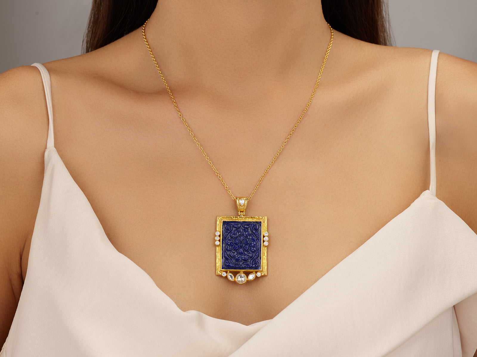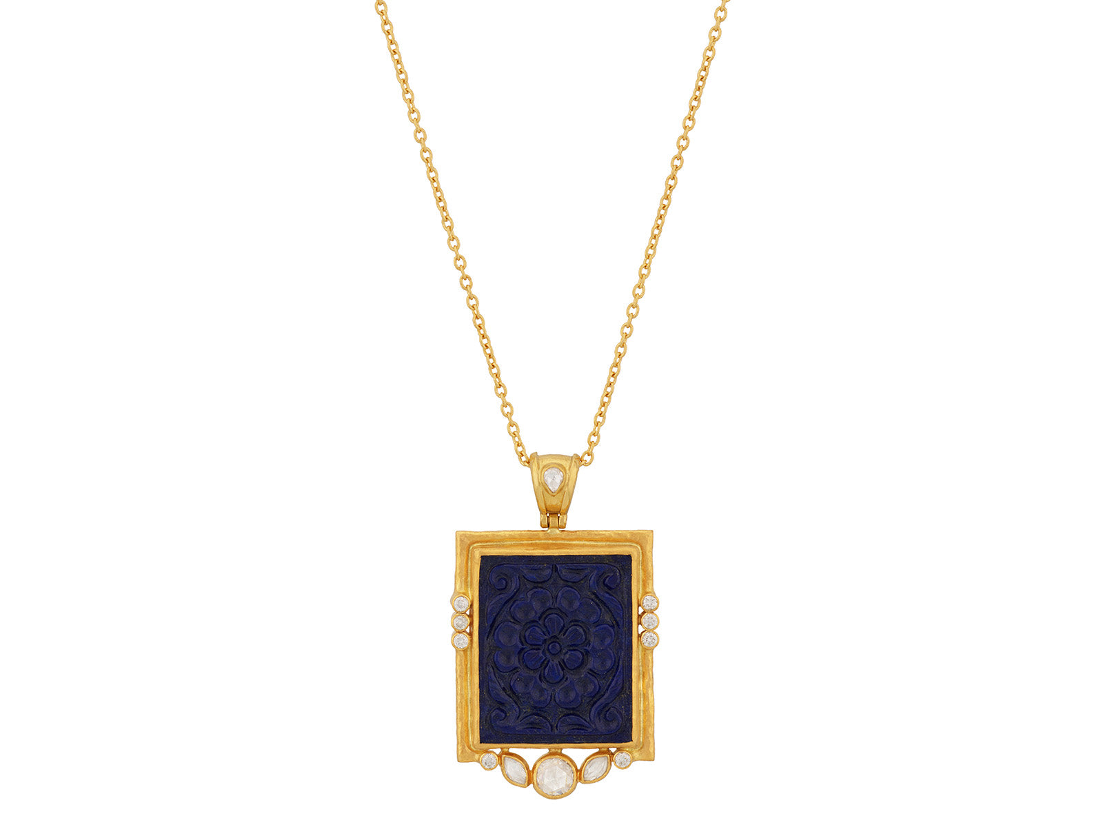 GURHAN Muse Gold Lapis Pendant Necklace, 31x25mm Carved Flower Lapis