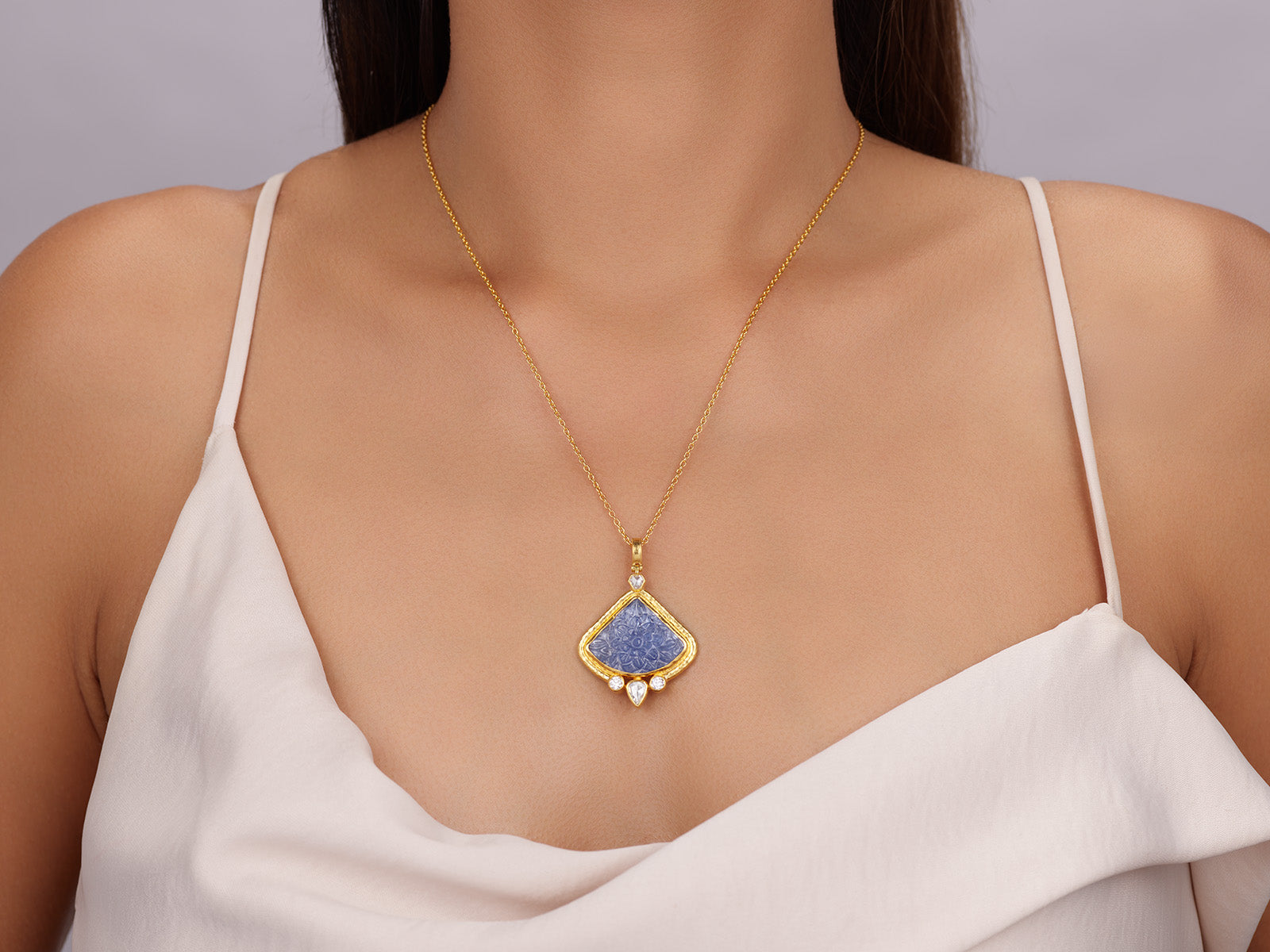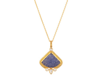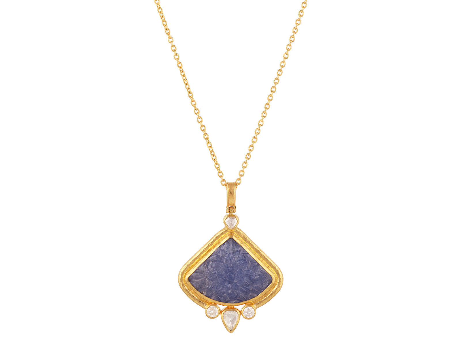 From the GURHAN Muse Collection, this one of a kind pendant necklace highlights a 24x20mm amorphous carved tanzanite of 10.60 carats framed in 24K gold, accented with mixed rose-cut and brilliant white diamonds totaling 0.71 carats. Suspended from a 16-18" 22K gold solid chain with an 18K gold detachable bale, it radiates poetic craftsmanship and rare elegance.