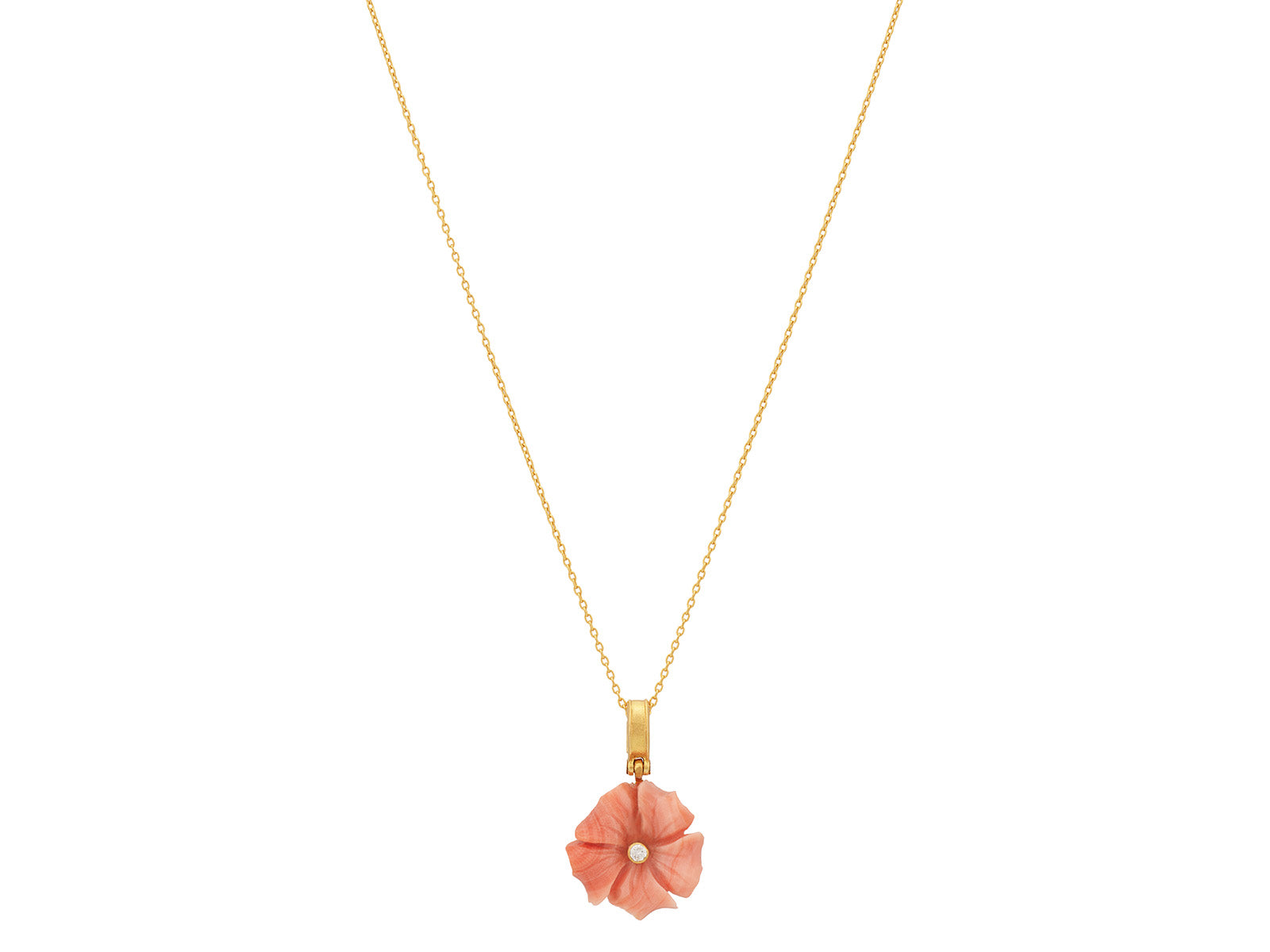 Sculpted in luminous 24K gold, this one of a kind Rune pendant centers a 15mm flower-shaped carved coral, celebrated for its singular character. A subtle brilliant-cut diamond accent adds quiet light, while the detachable hinged bale rests on a 16–18″ solid 22K gold chain, finished with an 18K gold lobster clasp.