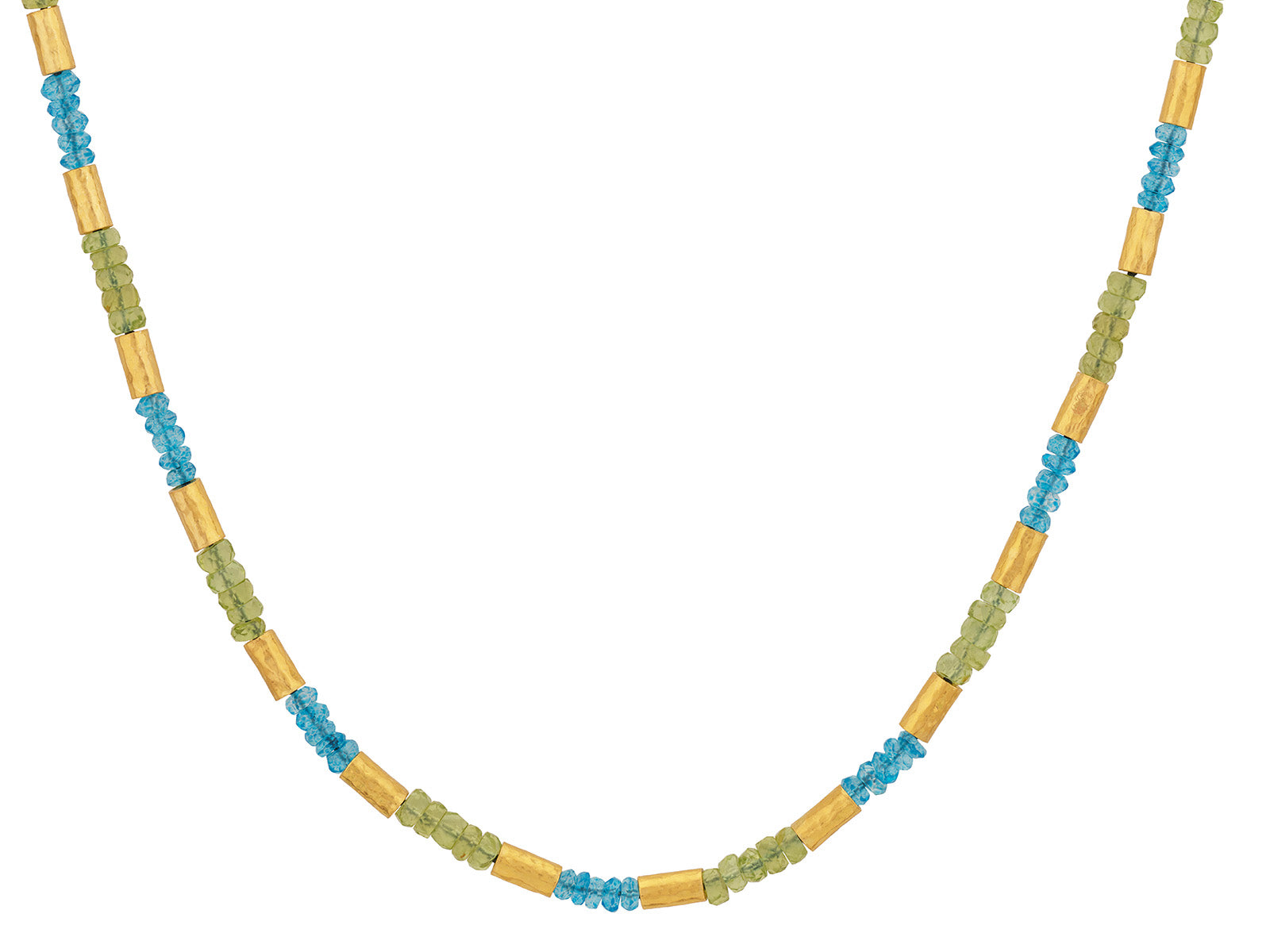 From the Vertigo collection, this one of a kind necklace unfolds as a luminous single strand of faceted peridot and blue topaz beads, accented by hand-hammered 24K gold tubes. A subtle brilliant-cut white diamond graces the 18K gold lobster clasp, completing a composition of depth, rhythm, and quiet refinement.