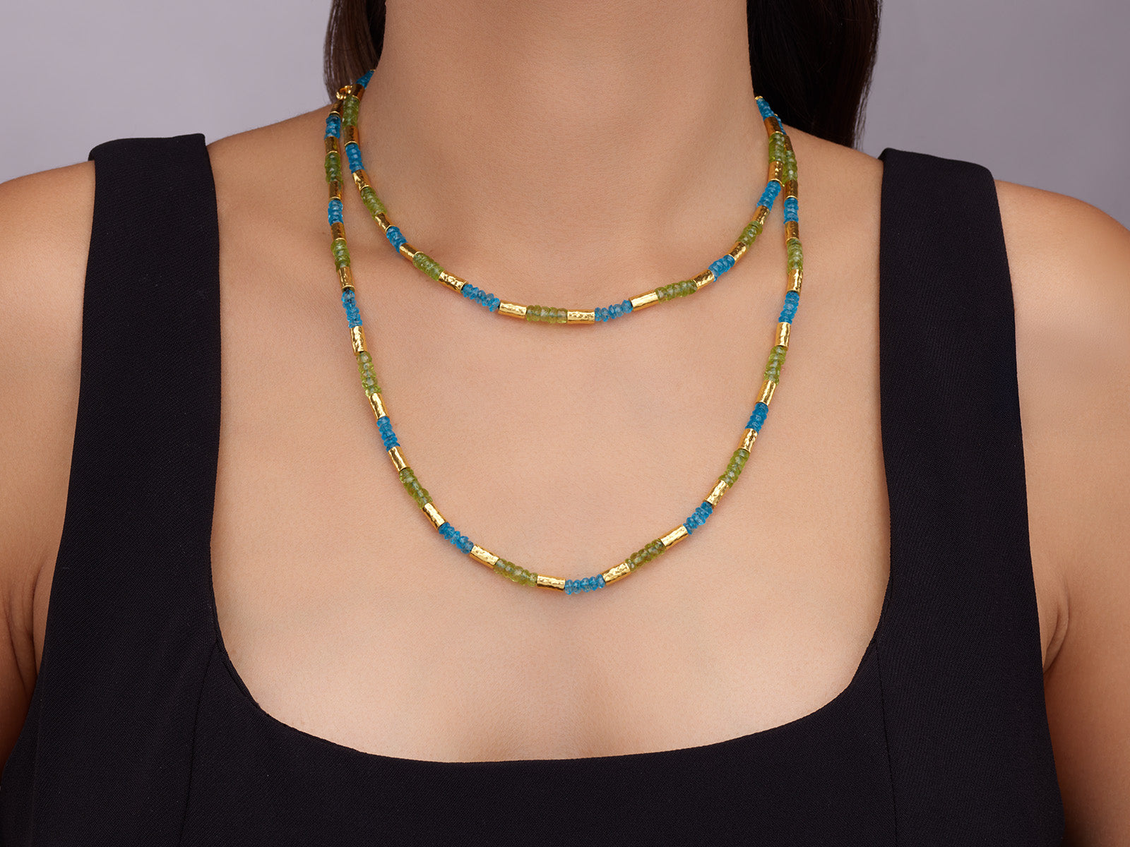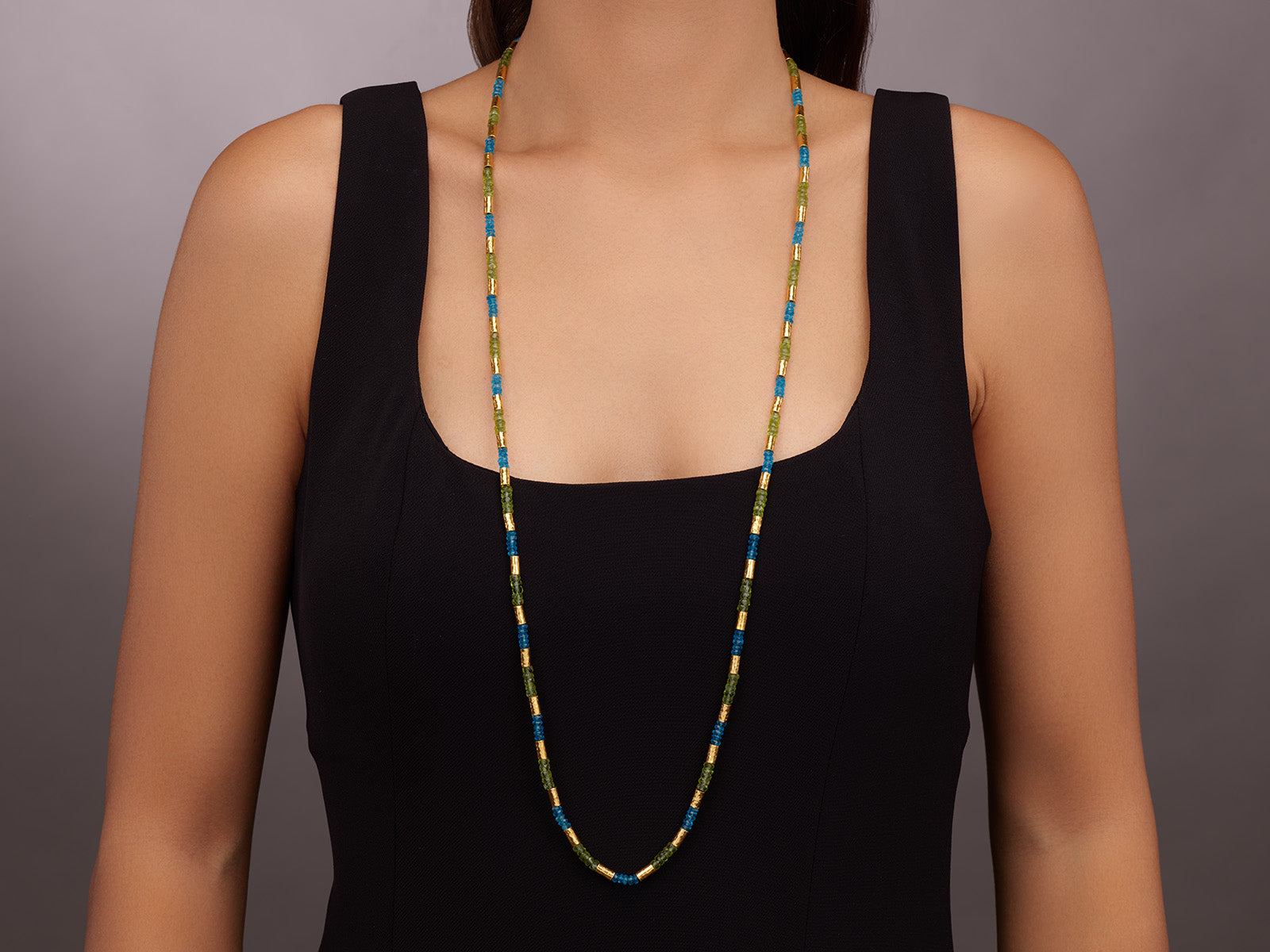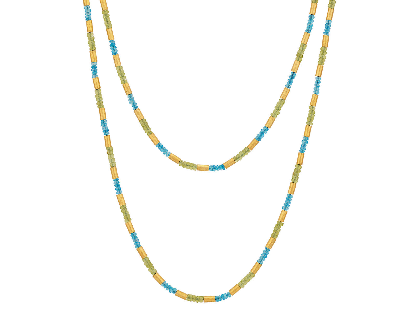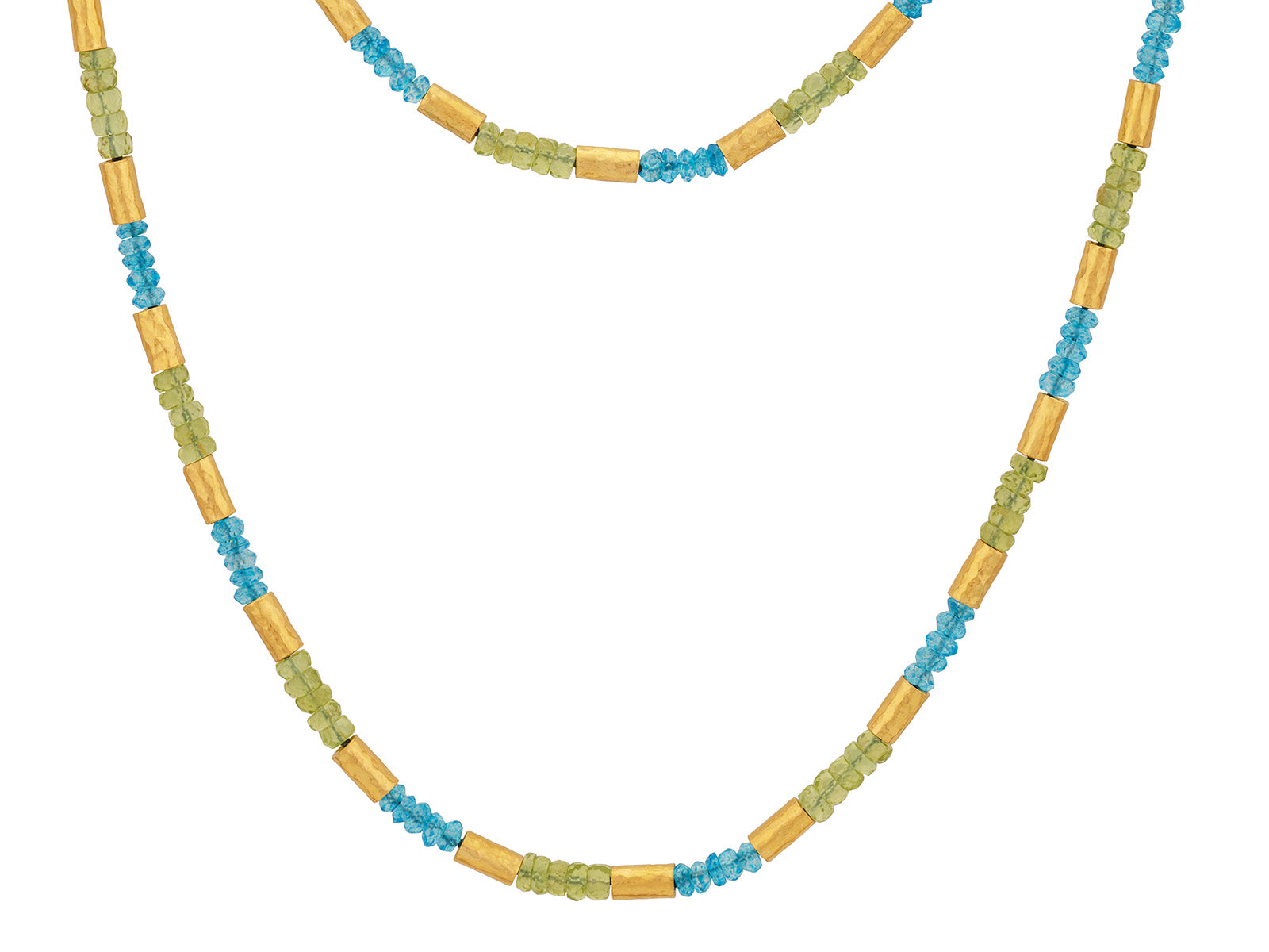 A one of a kind Vertigo necklace, composed of faceted peridot and blue topaz beads interspersed with hand-hammered 24K gold tubes. This single-strand design is finished with a refined 18K gold lobster clasp accented by a brilliant-cut diamond, offering luminous color, depth, and quiet distinction at 36 inches.