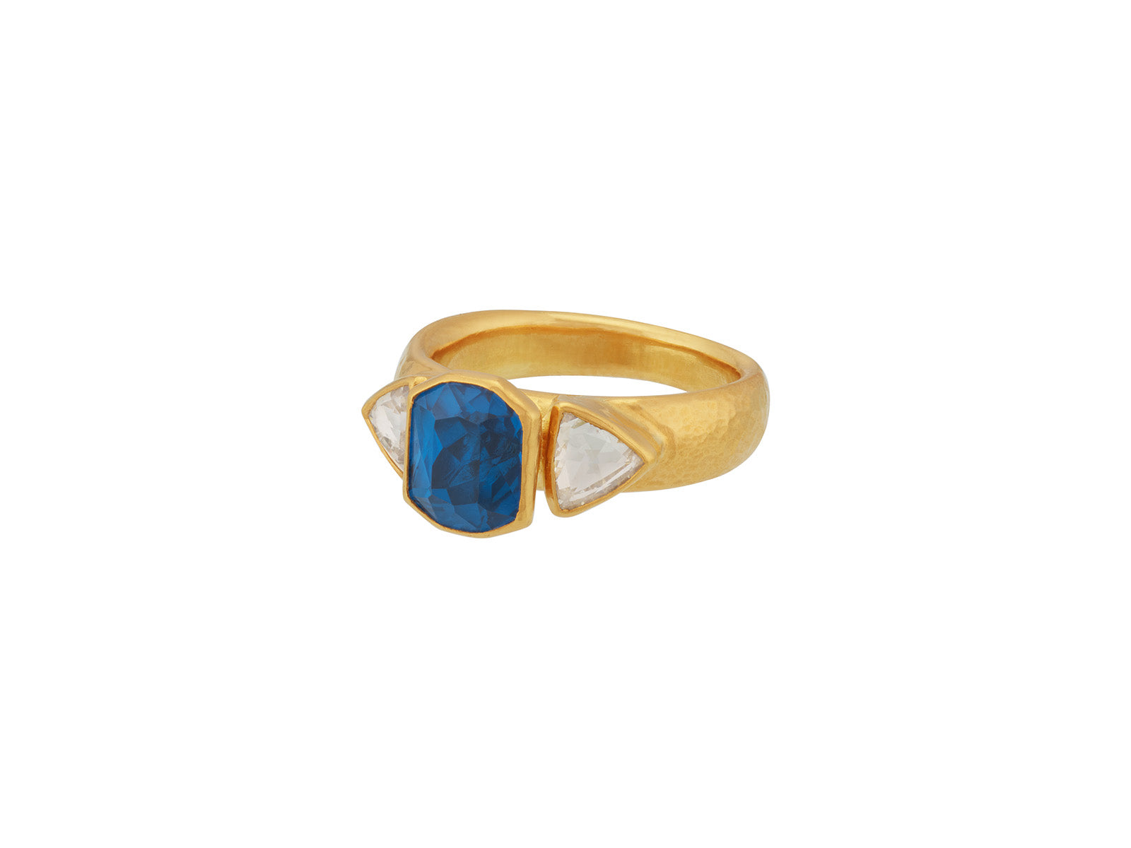 A singular expression of light and geometry, this one of a kind Prism ring is crafted in pure 24K gold. A vertically set 9×8 mm rectangular faceted blue topaz (3.70 ctw) is framed by rose-cut triangular white diamonds (1.08 ctw), rising from a finely graduated shank for a striking, sculptural presence.