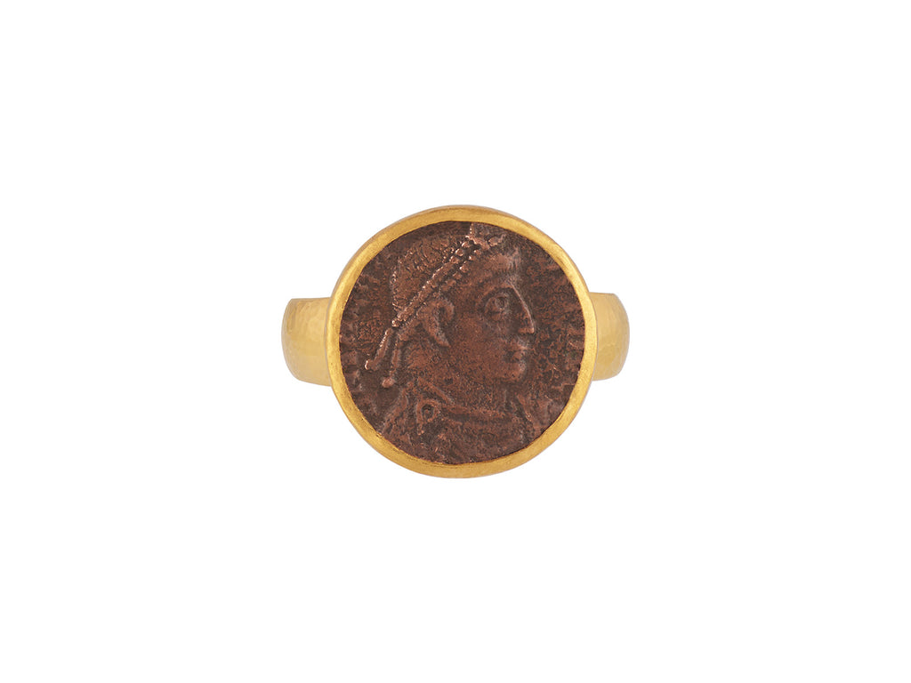 From the GURHAN Antiquities Collection, this one of a kind ring frames a 15mm Roman Imperial coin in radiant 24K gold, preserving history with sculptural elegance. Set on a slender graduated shank, it balances ancient heritage with refined modernity. A rare work of wearable art for the true collector.