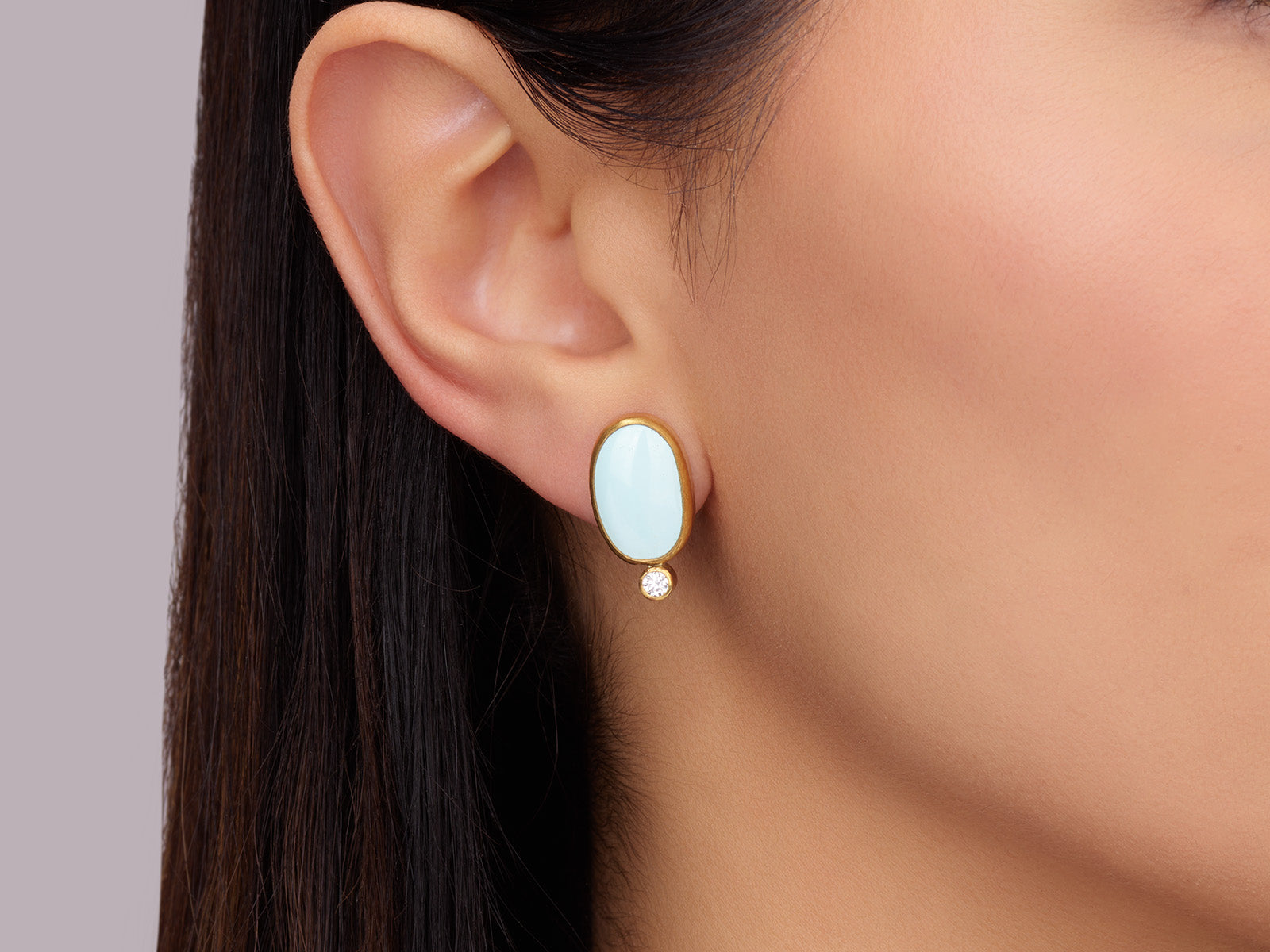 A singular expression of quiet strength, these Rune stud earrings showcase luminous 16x10mm oval cabochon Sleeping Beauty turquoise set in rich 24K gold, framed by brilliant white diamonds. An 18K gold clip post ensures refined comfort, while the balanced proportions create an enduring statement of rare beauty.