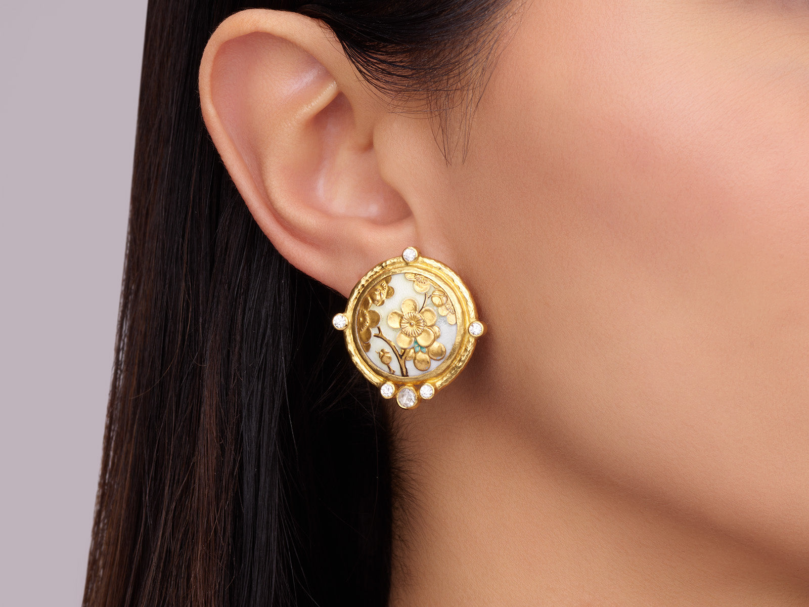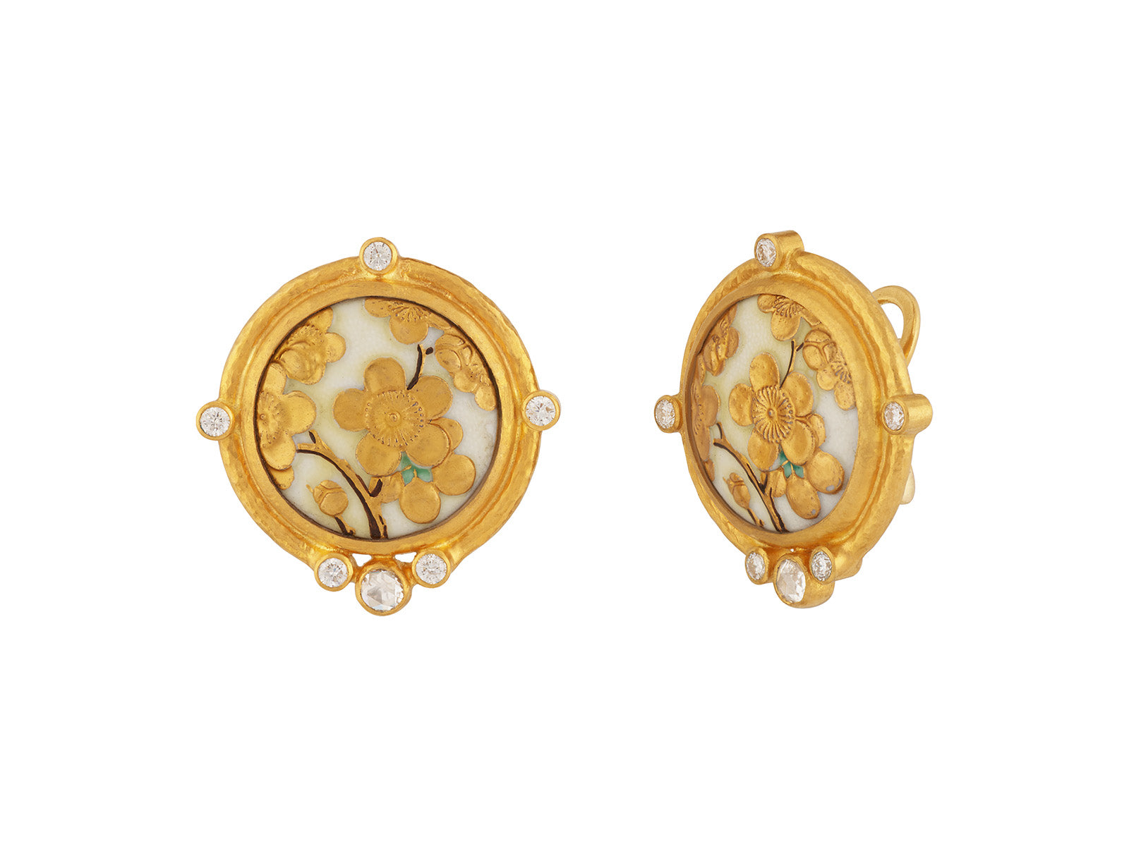 GURHAN Antiquities One-of-a-Kind 24K Gold Toshikane Clip Post Stud Earrings, 19mm Round Carved Toshikane Depicting a Cherry Blossom