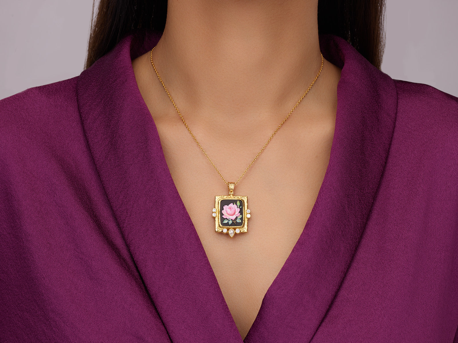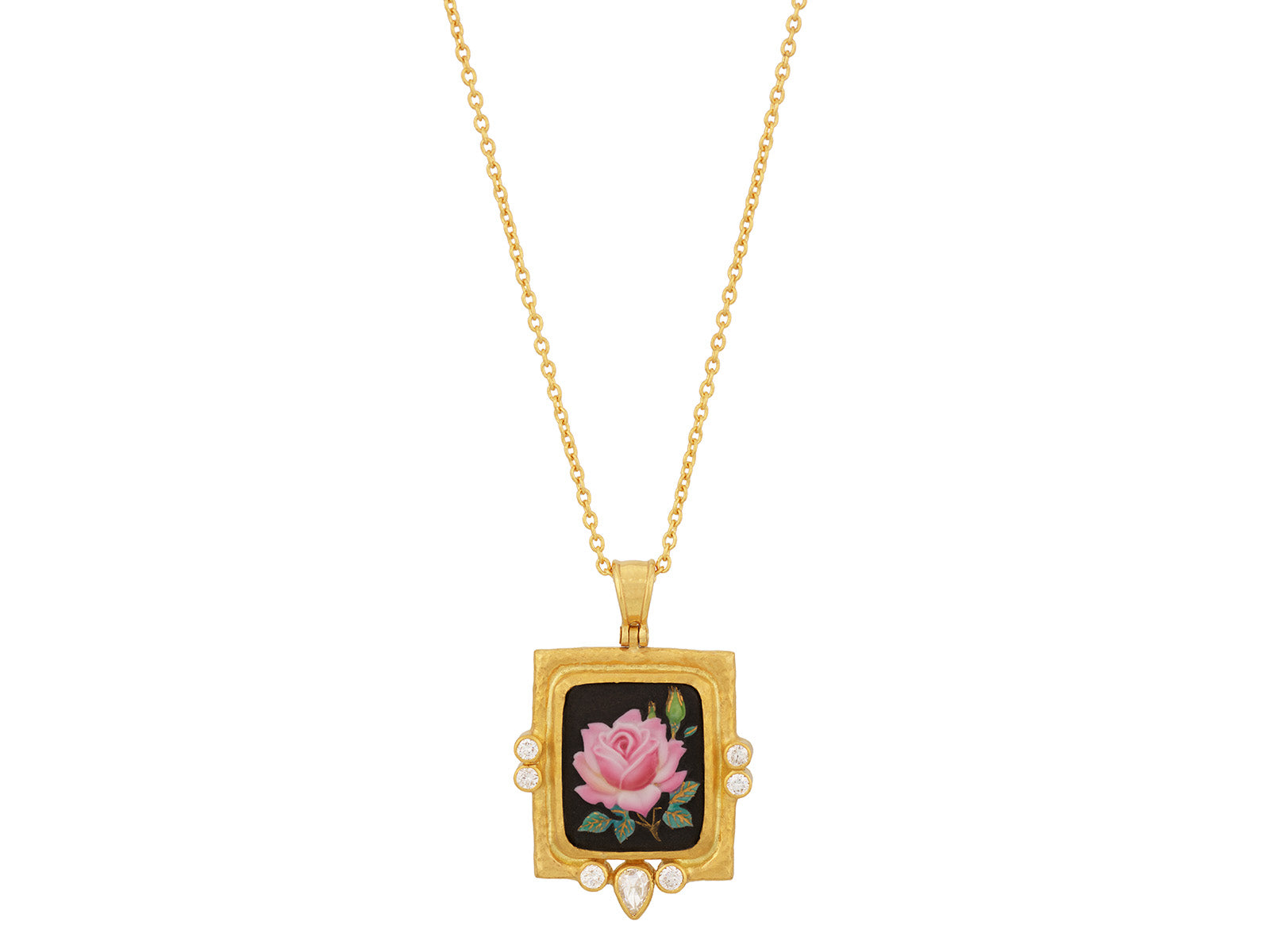 GURHAN Antiquities One-of-a-Kind 24K Gold Toshikane Pendant Necklace, 18x16mm Rectangle Carved Toshikane Depicting a Pink Rose