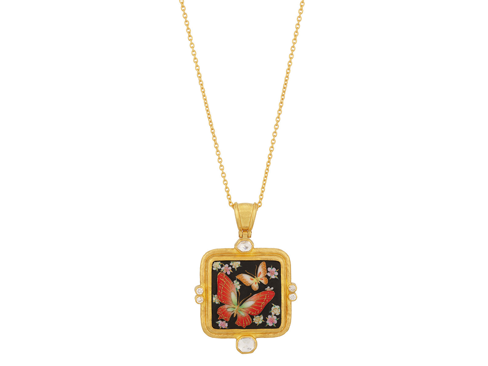 A rare expression of heritage and artistry, this one of a kind Antiquities pendant is crafted in luminous 24K gold, centered with a 23mm square carved Toshikane butterfly. Framed by rose-cut and brilliant white diamonds, it is finished with an 18K detachable hinged bale and a refined 22K gold chain.