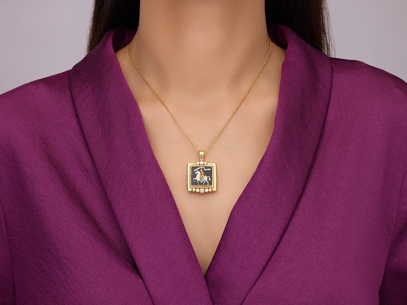 A rare Antiquities creation honoring the legendary courage of Saint George, centered with a 16mm square carved Toshikane set in luminous 24K gold. Framed by mixed-shape brilliant white diamonds and finished with a wide gold surround, this one of a kind pendant is suspended from a 16–18" solid 22K gold chain with an 18K detachable hinged bale and lobster clasp.