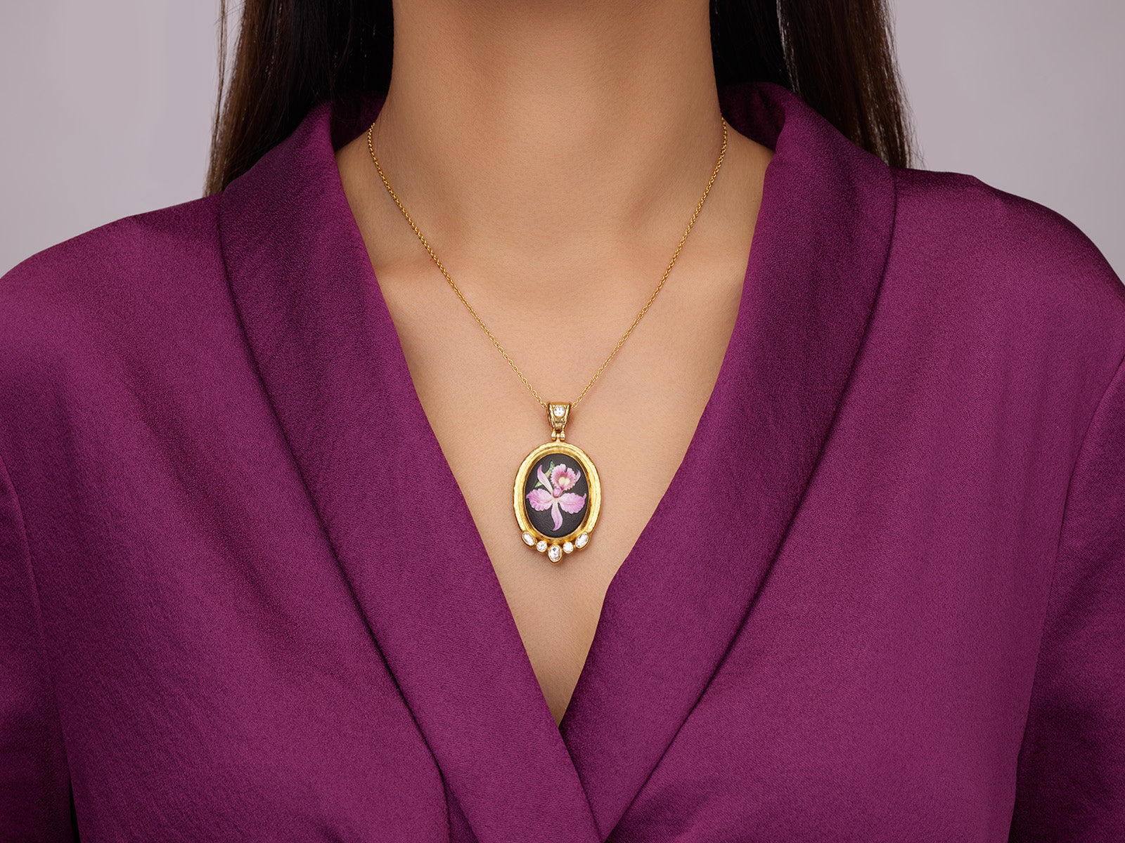 An ode to timeless artistry, this one of a kind pendant centers a 26x20mm oval carved Toshikane Orchid in luminous 24K gold, framed by rose cut and brilliant white diamonds. A wide gold bezel and diamond-set detachable hinged bale complete the design, suspended from a 16–18" solid 22K gold chain with 18K lobster clasp.