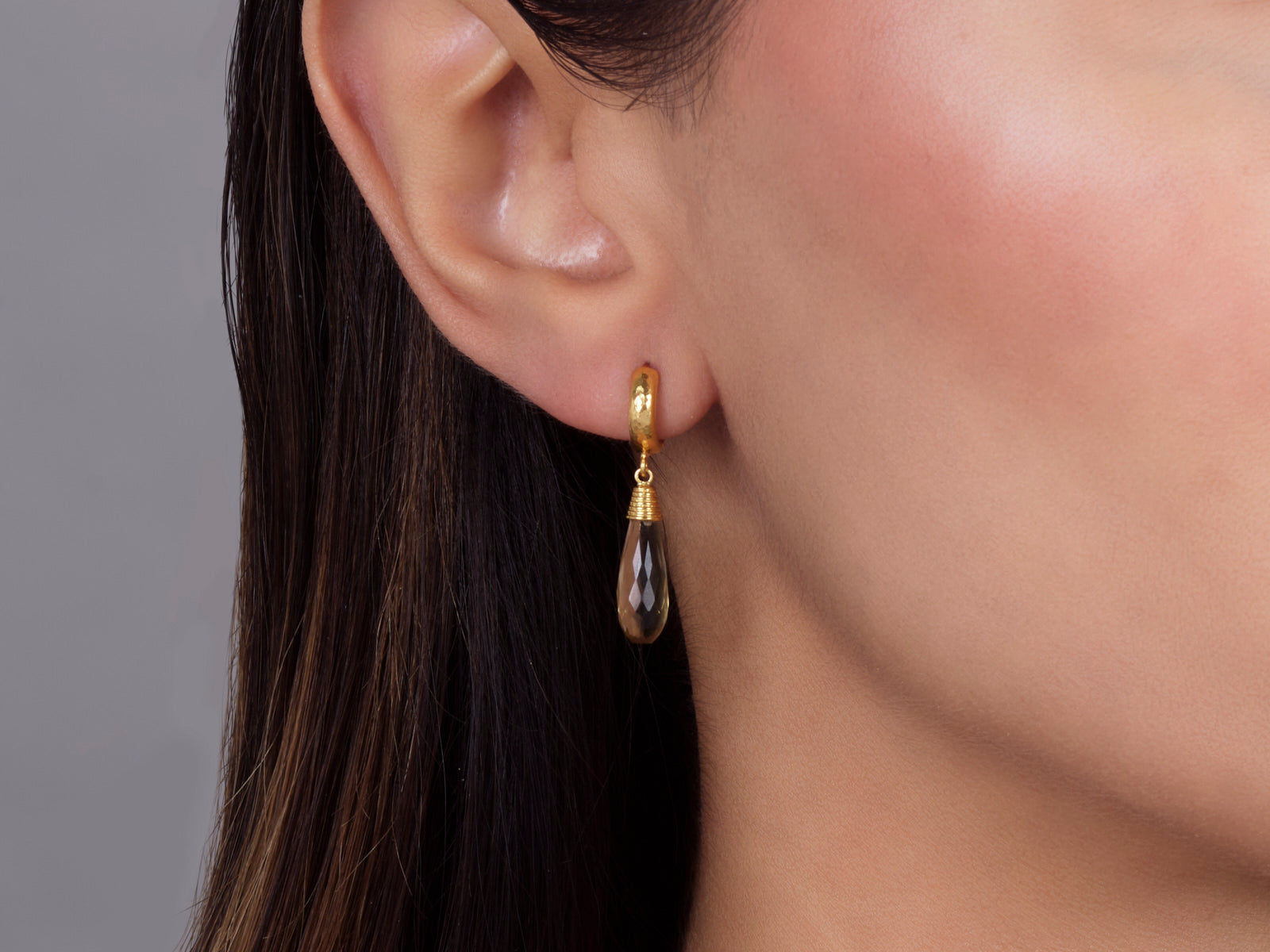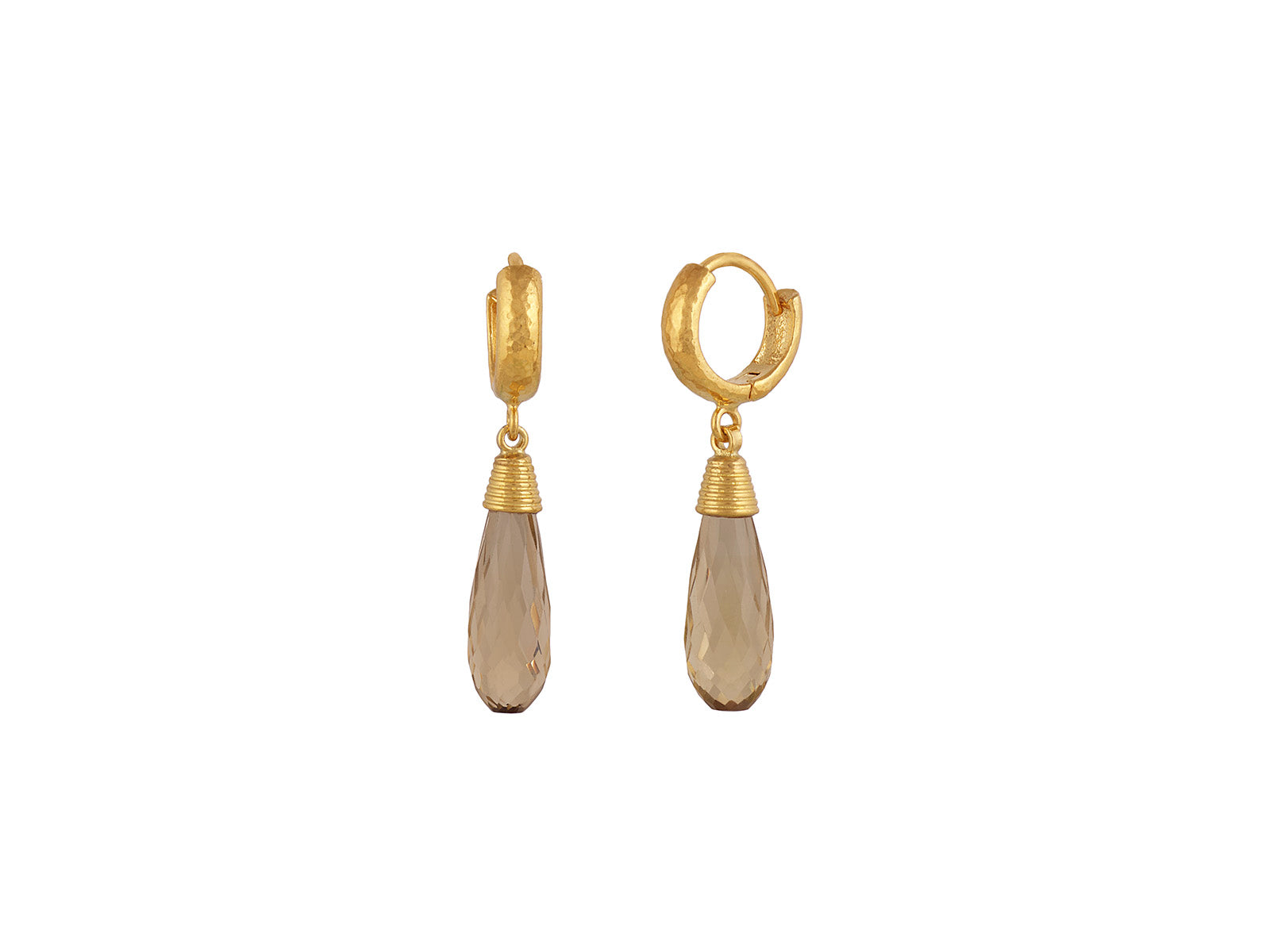 Graceful and radiant, these one of a kind drop earrings from the Crown Collection feature faceted 16x6mm champagne quartz (6.45 ctw) suspended beneath a 24K gold coiled cap. A refined 22K gold huggie and 18K post complete the 1.158" design, offering an elegant interplay of rare materials and timeless craftsmanship.