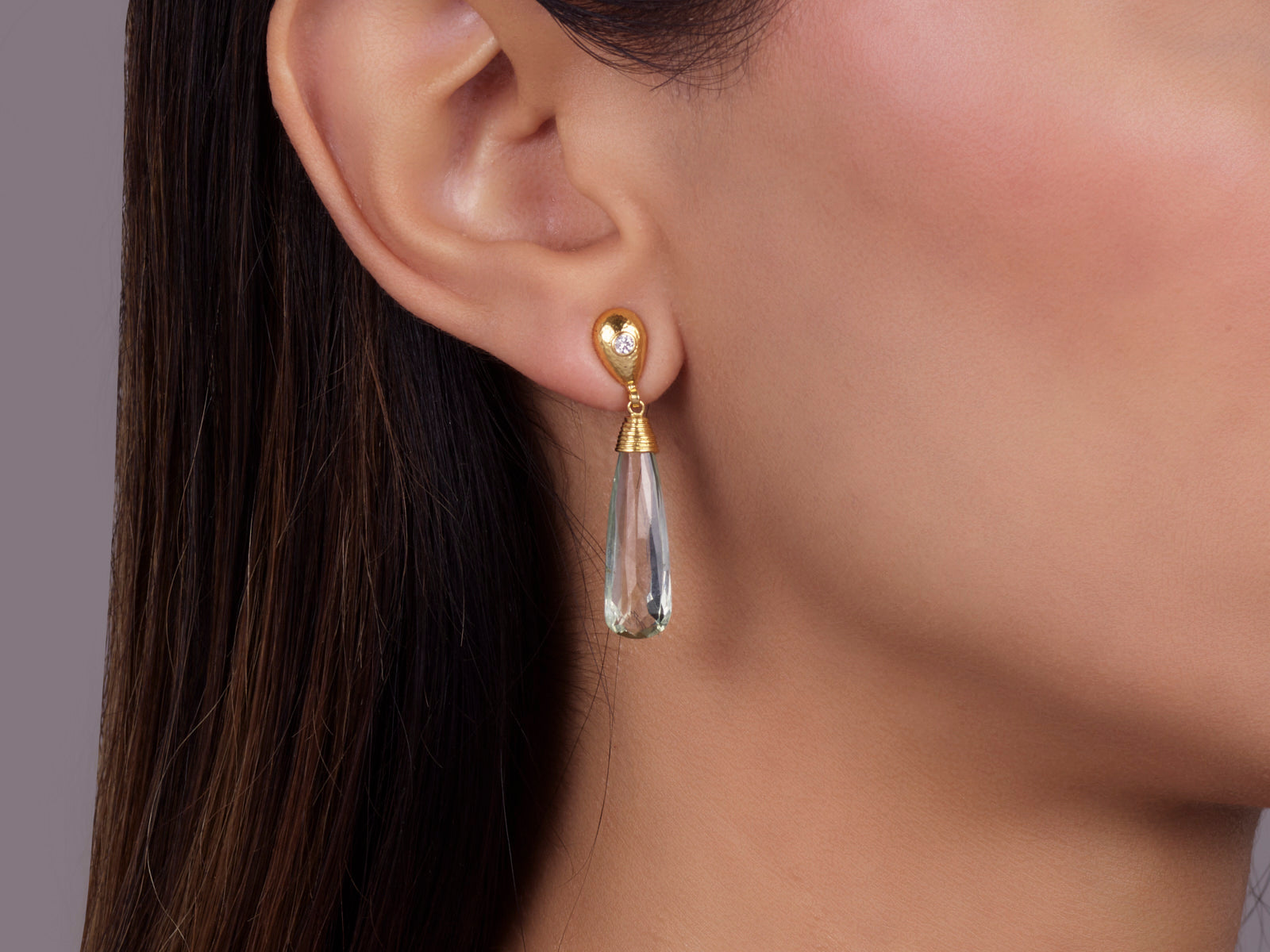 A one of a kind statement of refinement, these single-drop earrings feature 24K gold encasing a luminous 28x8mm faceted mint quartz of 17.45 ctw. A brilliant white diamond crowns the 22K gold droplet top, while an 18K gold post ensures a secure fit. At 1.58" in length, they radiate rare artistry and timeless elegance.