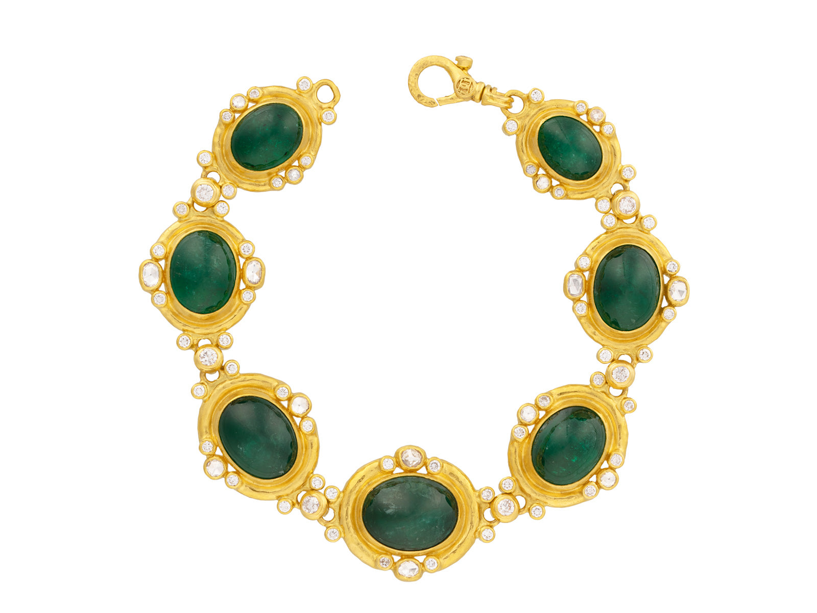 GURHAN Muse One-of-a-Kind 24K Gold Emerald All Around Single-Strand Bracelet, Mixed Cabochon Ovals set in Diamond Accent Frames