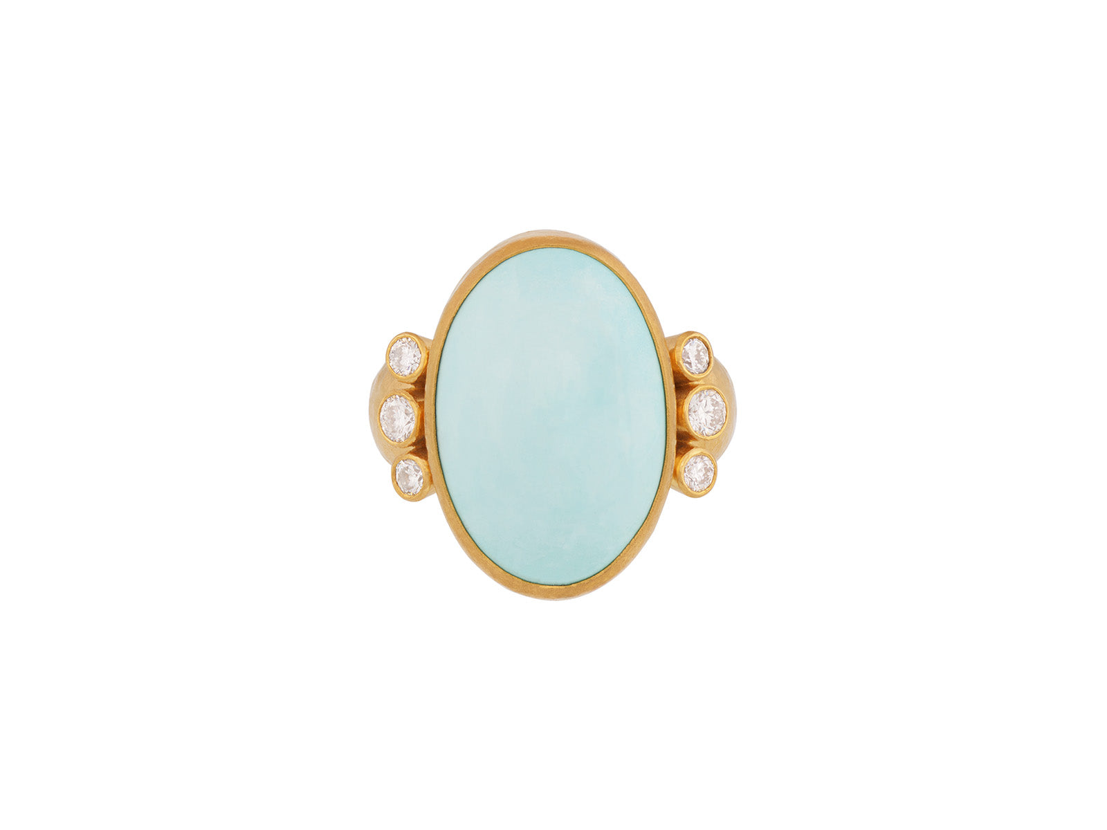 A singular expression of the Rune collection, this one of a kind ring is crafted in luminous 24K gold and set with a 21x15mm oval cabochon Sleeping Beauty turquoise. Brilliant-cut white diamonds frame the vertical centerpiece, while a bold graduated shank lends sculptural presence—an enduring symbol of strength, clarity, and refined artistry.