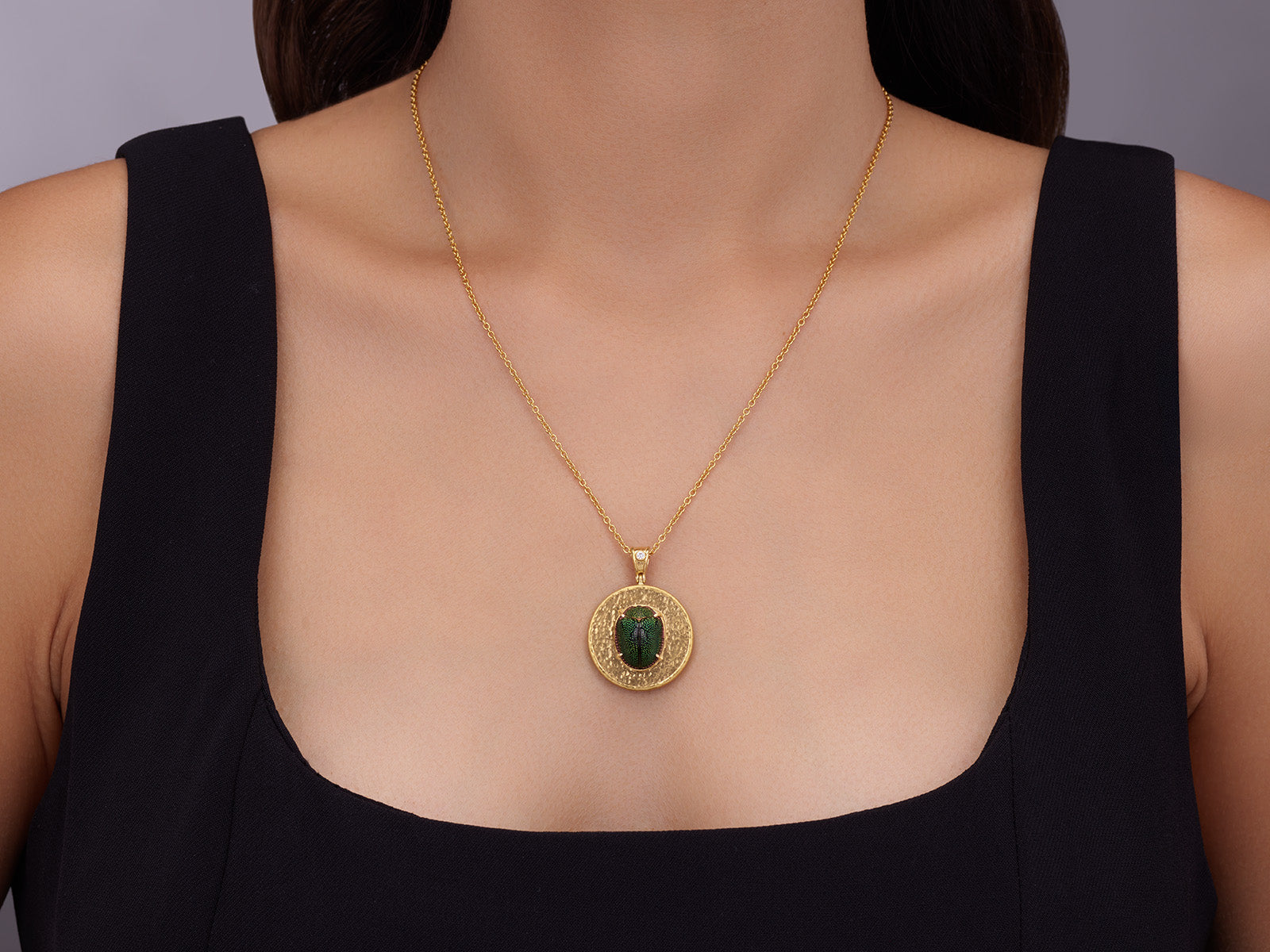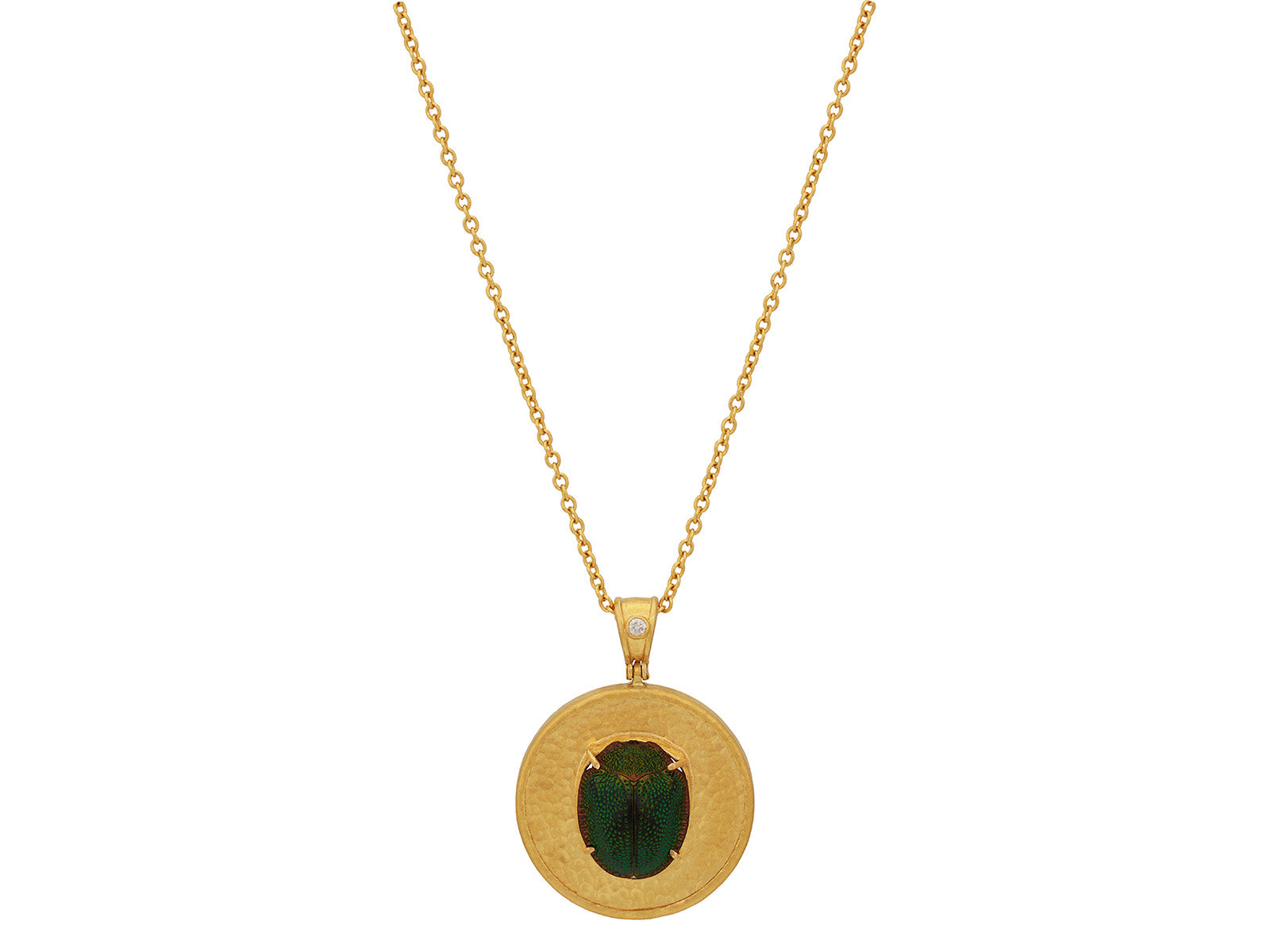 GURHAN Antiquities Gold Real Scarab Pendant Necklace, 15x11mm Real Scarab With 24mm Round Magnifying Glass