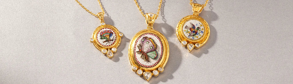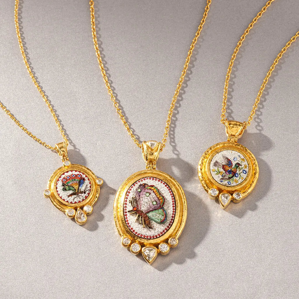 A micro mosaic depicting a dove and forget-me-not flowers brings botanical poetry to this one-of-a-kind Antiquities necklace. Crafted in 24K gold with wide frame, the 21mm round carved micro mosaic weighing 19.10 carats is enhanced by a drop rose cut white diamond (0.34 carats) and brilliant cut white diamonds (0.38 carats). The pendant hangs from an 18K gold detachable hinged bale on a 16-18" solid 22K gold chain with 18K gold lobster clasp. Timeless mosaic technique meets nature's delicate beauty.