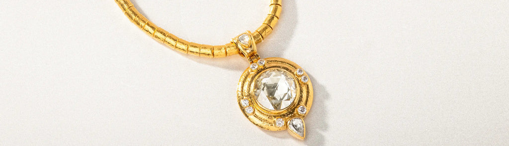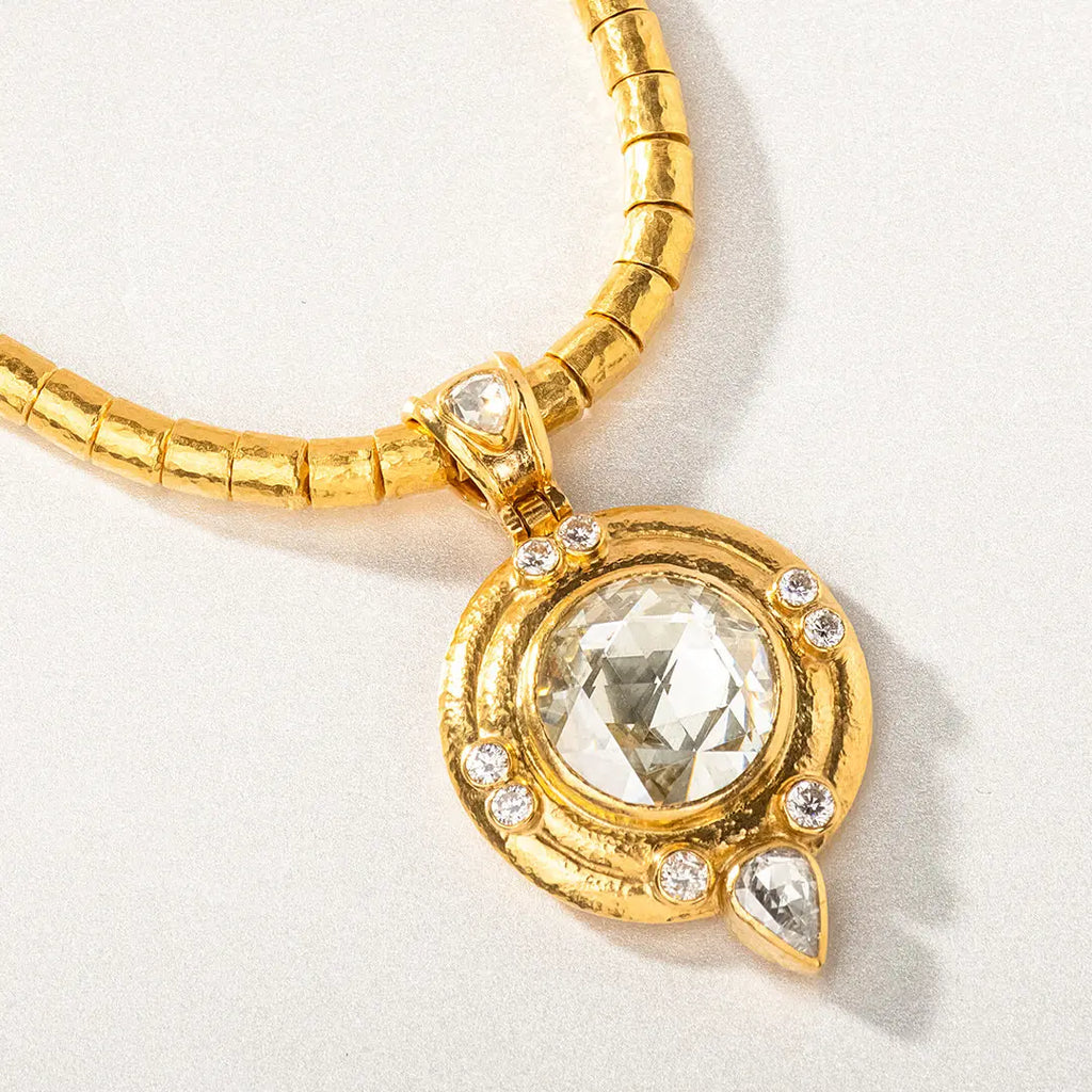 A 6.20-carat rose cut diamond takes pendant form in this one-of-a-kind Elements necklace. The 20mm round rose cut white diamond is set in a wide 24K gold frame, surrounded by drop rose cut white diamonds (1.21 carats) and brilliant cut white diamonds (1.43 carats). The pendant hangs from an 18K gold hinged detachable bale with diamond on a 24" 24K gold oval link chain, secured with an 18K gold lobster clasp. This Elements pendant celebrates the substantial beauty of a single exceptional diamond through refined framing.