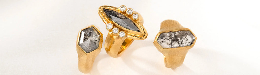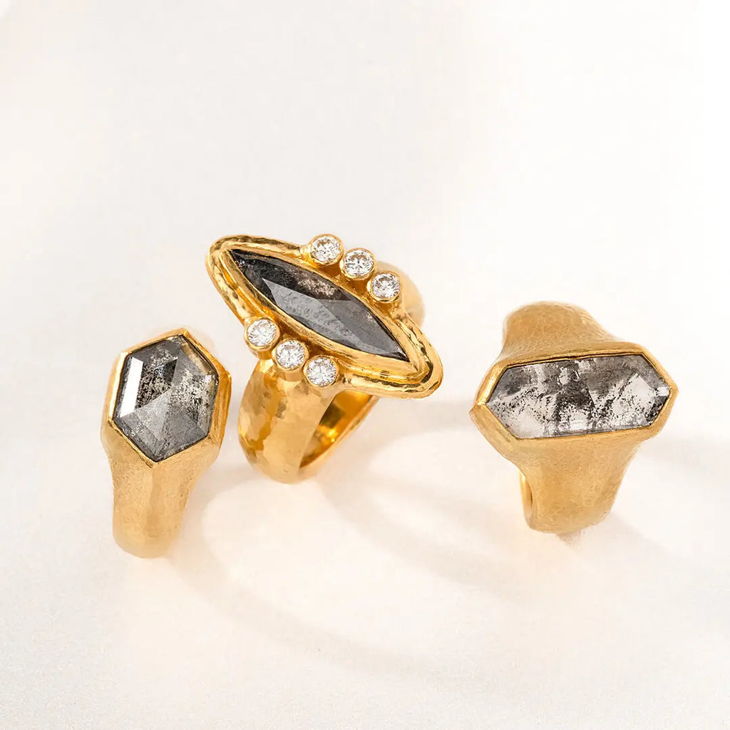 Hexagonal geometry meets diamond luminosity in this one-of-a-kind Elements cocktail ring. Crafted in 24K gold, the ring features a 14x11mm hexagon rose cut salt and pepper diamond weighing 6.24 carats, set horizontally on a small graduated 24K gold shank. This ring celebrates the unique character of salt and pepper diamonds through angular form.
