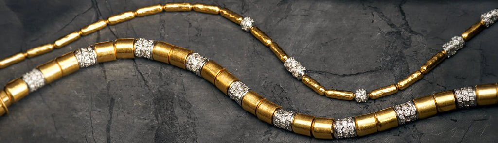 Diamond stations punctuate 24K gold Vertigo tubes in this single-strand necklace. The piece features brilliant cut white diamonds set in 18K white gold pavé stations between 24K gold vertigo tubes, totaling 7.938 carats, with additional brilliant cut white diamonds (0.032 carats). At 36" in length, the necklace is secured with an 18K gold lobster clasp. This Vertigo necklace demonstrates GURHAN's approach to creating rhythm through gold form and diamond punctuation.