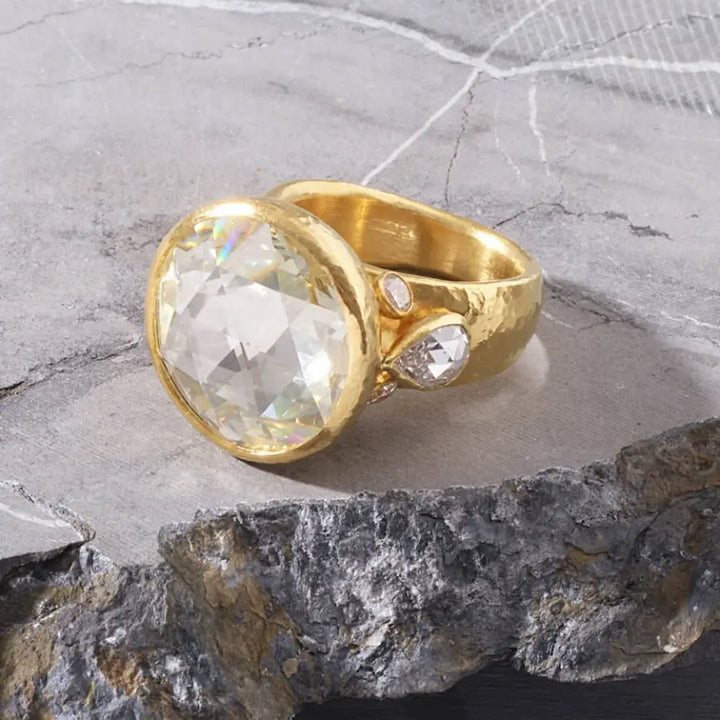 From the GURHAN Elements Collection, this one-of-a-kind center stone ring is the epitome of elegance. A 20mm round rose cut white diamond, weighing 6.30 carats, is encased in a 24K gold bezel and sits at the center of this exquisite piece. The ring is further adorned with drop rose cut white diamonds of 1.46 carats and brilliant cut white diamonds of 0.532 carats. This stunning piece is completed with a large, graduated 24K gold shank, bringing an additional touch of luxury and comfort.