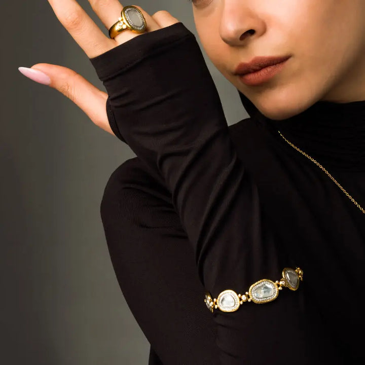 This GURHAN Pointelle bracelet offers an embodiment of luxury and elegance. Crafted from high-quality 22K gold, the bracelet features interlocking U-shaped links, studded with four brilliant cut white diamonds weighing a total of 5.16 carats. Additionally, more brilliant cut white diamonds totaling 0.14 carats are incorporated to add a sophisticated sparkle. The length of the bracelet is adjustable between 7.5" and 8.5" with a handmade 22K gold lobster clasp and a 1" extension chain embellished with diamonds. A stylish and radiant piece of the Pointelle Collection, it is perfect for those seeking a blend of classic design and contemporary appeal.