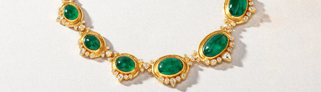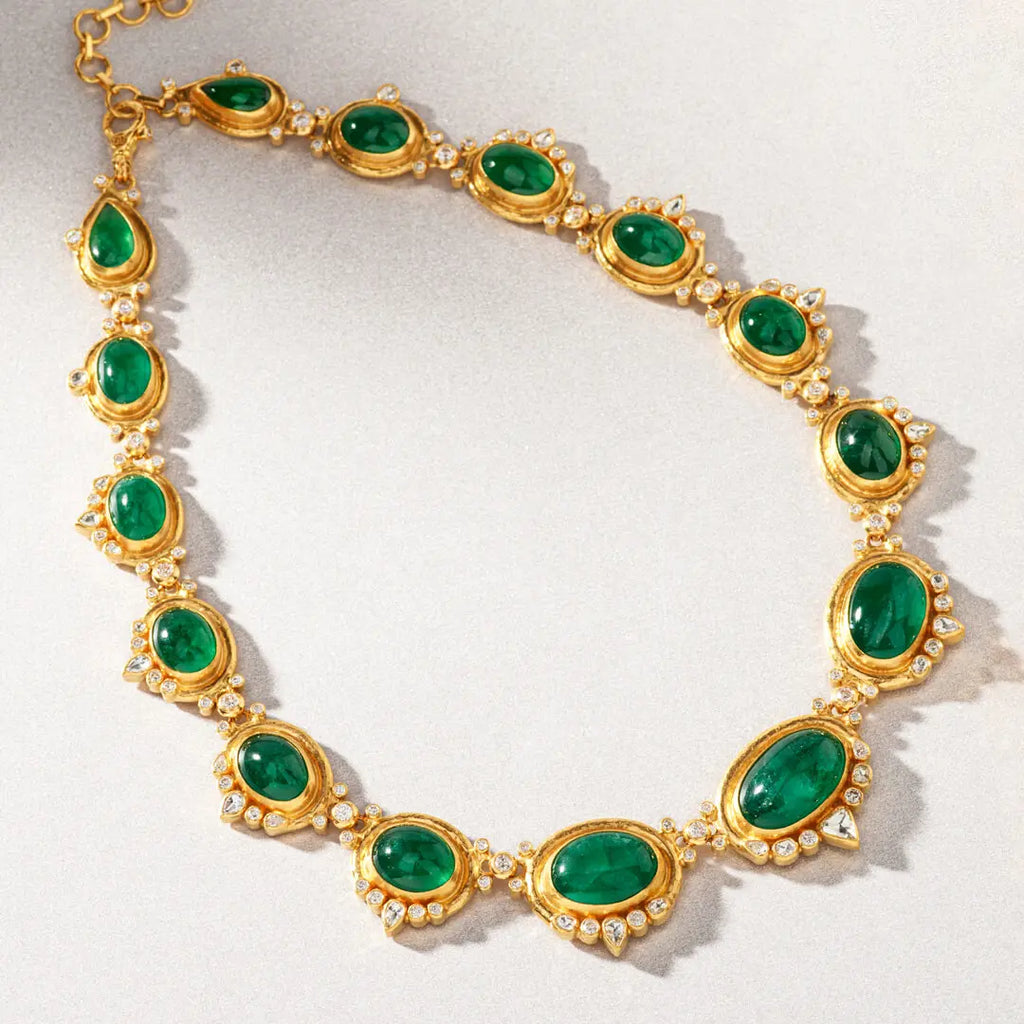 Emerald opulence circles the neck in this one-of-a-kind Muse necklace. Crafted in 24K gold, the piece features mixed-sized and shaped cabochon emeralds totaling 137.96 carats. Mixed-shaped rose cut white diamonds weighing 2.65 carats add luminous accents, while the signature butterfly connection adorned with 5 brilliant cut white diamonds (3.108 carats) and additional brilliant cut diamonds (2.22 carats) complete the design. Adjustable from 17 to 18.5", secured with a 22K gold handmade lobster clasp and 1.5" extension chain with diamonds. This necklace celebrates emerald in extraordinary abundance through GURHAN's artistry.
