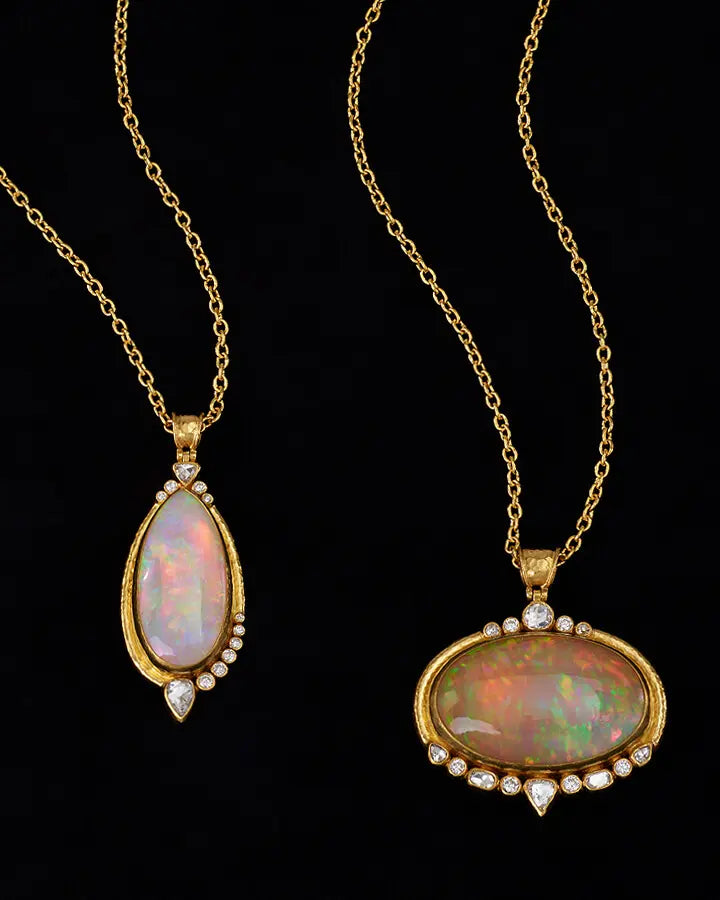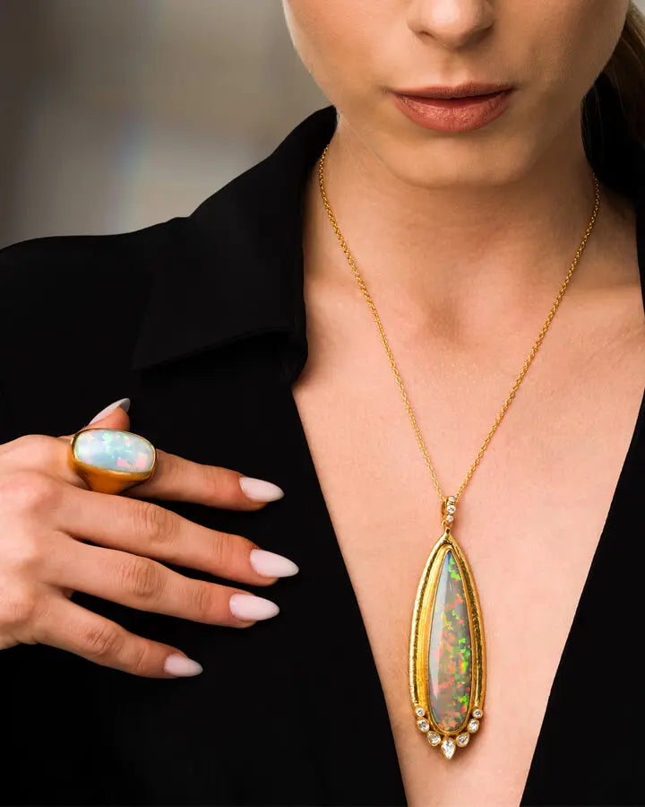 A kaleidoscope of colors dance within each unique opal and shift and shimmer as light interacts with them. Our curated selection showcases the opal's unique beauty in breathtaking designs, featuring intricate settings and dazzling diamonds that enhance the opal's natural allure.