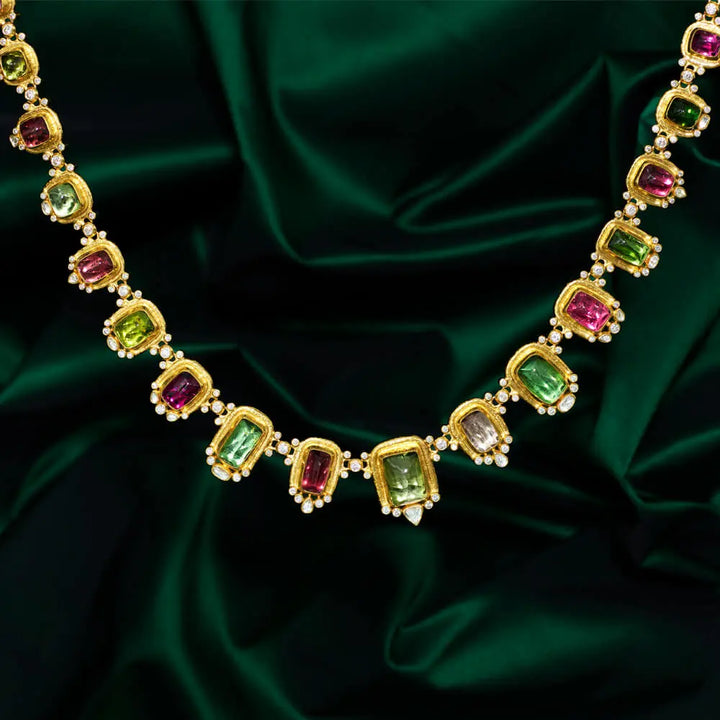 This GURHAN Muse necklace is a true one-of-a-kind piece, displaying an assortment of mixed-sized sugarloaf tourmalines housed in 24K gold wide bezels. The multi-colored tourmalines hold a total carat weight of 140.68. The design is enriched with mixed shaped rose cut white diamonds with a total weight of 1.73 carats. The unique butterfly connection presents 5 brilliant cut white diamonds, with a total carat weight of 3.708. Additional brilliant cut white diamonds weigh in at 2.356 carats. The necklace measures between 16.5 and 18 inches in length and features a 22K gold handmade lobster clasp, as well as a 1.5" extension chain adorned with diamonds. Showcasing a captivating array of colors and shapes, this all-around necklace is a tribute to the inspiring beauty of the Muse Collection.