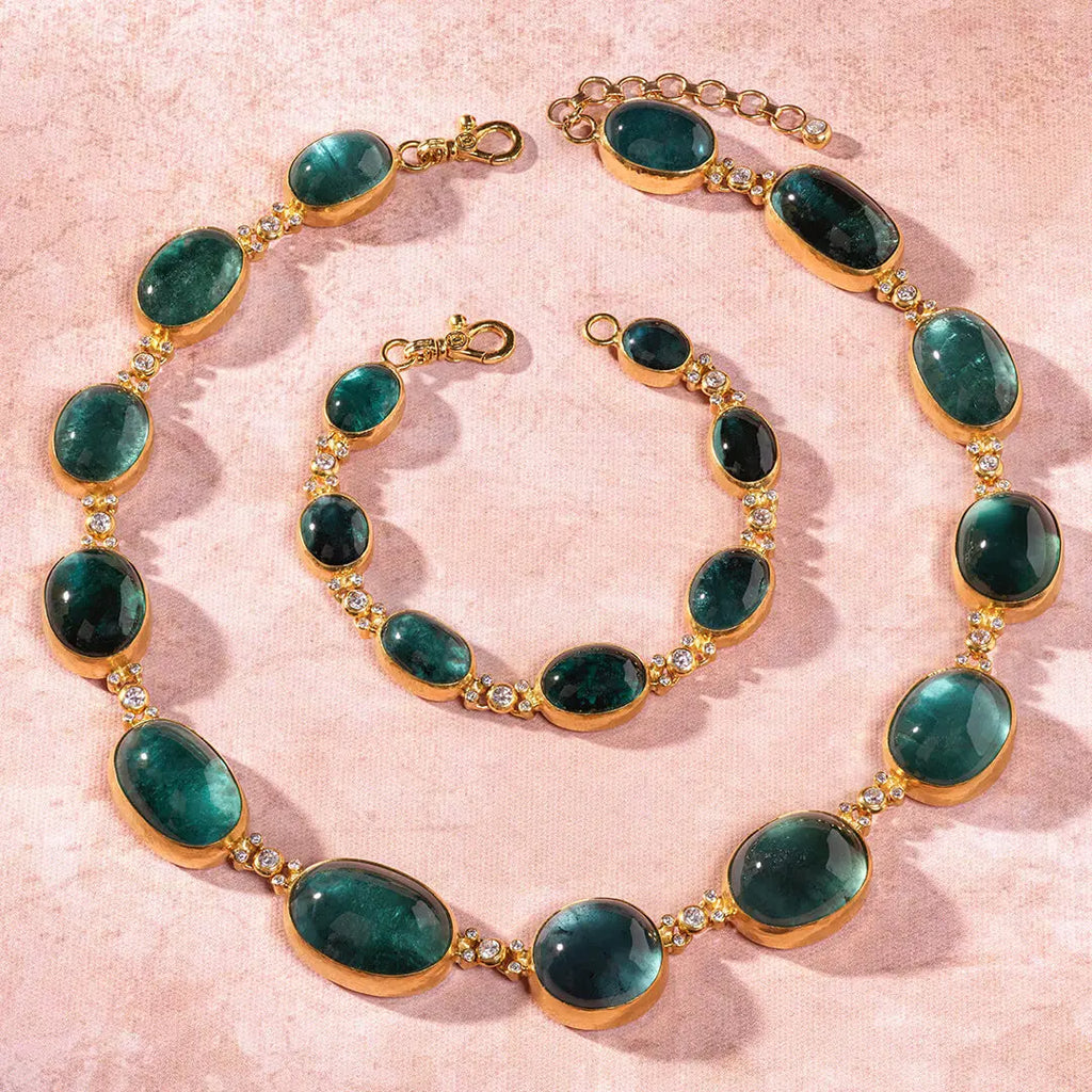 Green tourmalines circle the wrist in this one-of-a-kind Rune bracelet. Handcrafted in 24K gold, the piece features mixed-sized oval cabochon green tourmalines totaling 53.09 carats. The signature butterfly connection is set with 5 brilliant cut white diamonds weighing 1.09 carats. At 7.25" in length, the bracelet is secured with an 18K gold lobster clasp. This bracelet brings the saturated beauty of green tourmaline to the wrist.
