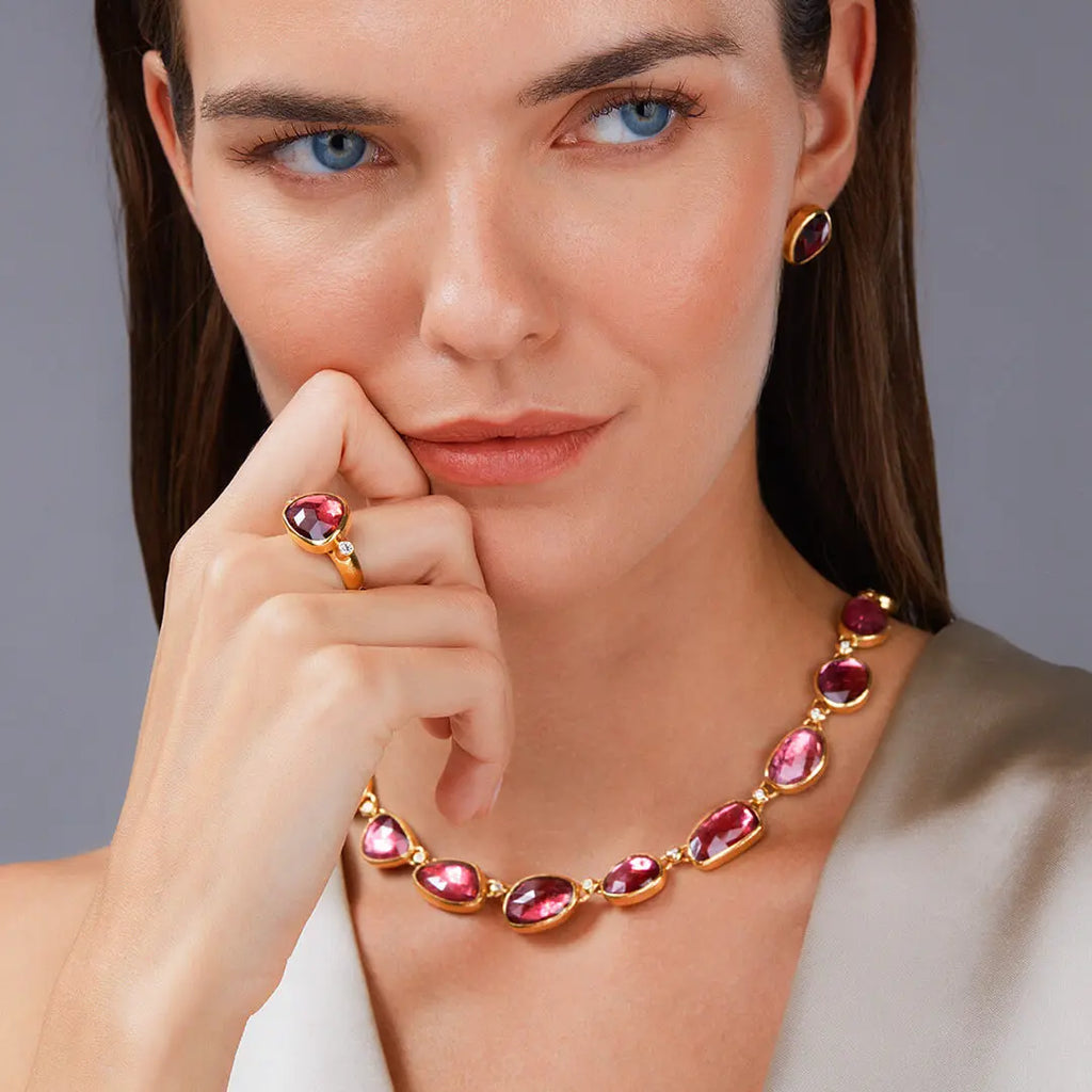 Pink tourmalines in mixed shapes circle the neck in this one-of-a-kind Rune necklace. Crafted in 24K gold, the piece features mixed-sized and shaped cabochon pink tourmalines totaling 88.70 carats, accented with brilliant cut white diamonds weighing 0.67 carats. Adjustable from 15.75 to 17.5", the necklace is secured with a 22K gold lobster clasp and extension chain. This necklace showcases pink tourmaline in substantial quantity and quality.