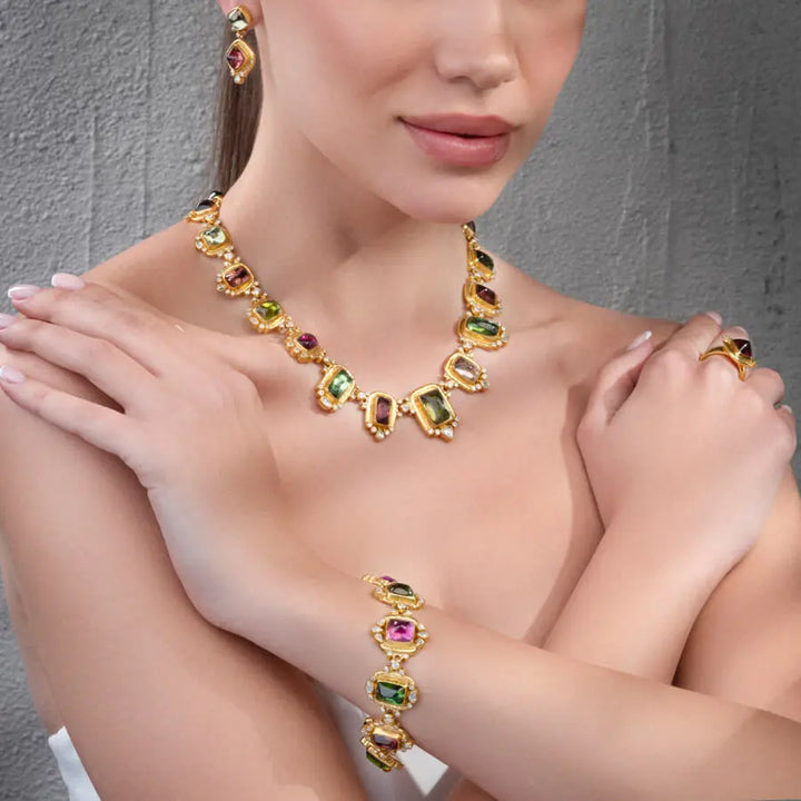 GURHAN Rune Collection - A Dance of Colors: This single-strand bracelet is a vibrant statement of elegance. Its unique design features a kaleidoscope of mixed size oval cabochon tourmalines, each set in a 24K gold bezel, boasting a total carat weight of 84.97. This piece is truly one-of-a-kind, sporting a beautiful butterfly connection encrusted with 5 brilliant cut white diamonds, having a total carat weight of 1.04. The 7-8" bracelet is finished with a handmade 22K gold lobster clasp and includes a 1" extension chain. This GURHAN Rune Collection bracelet truly captures the diverse beauty of tourmalines in all their splendor.