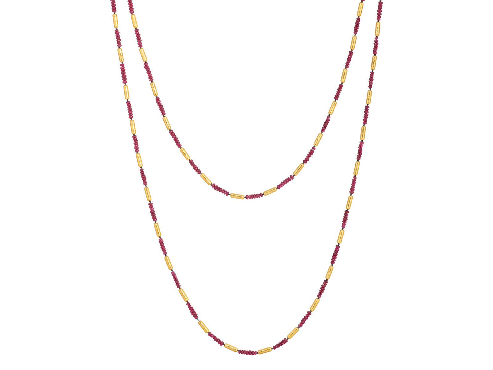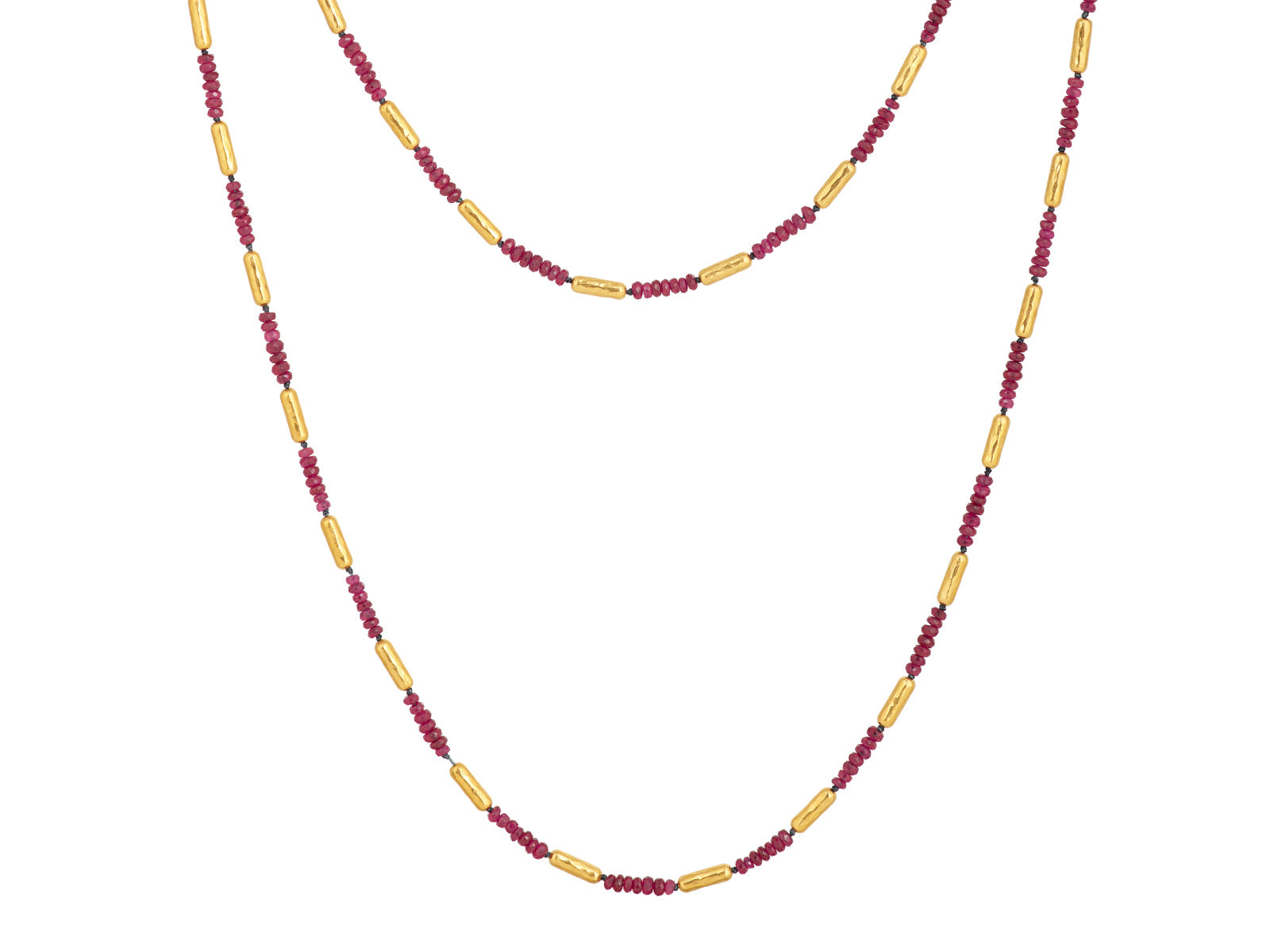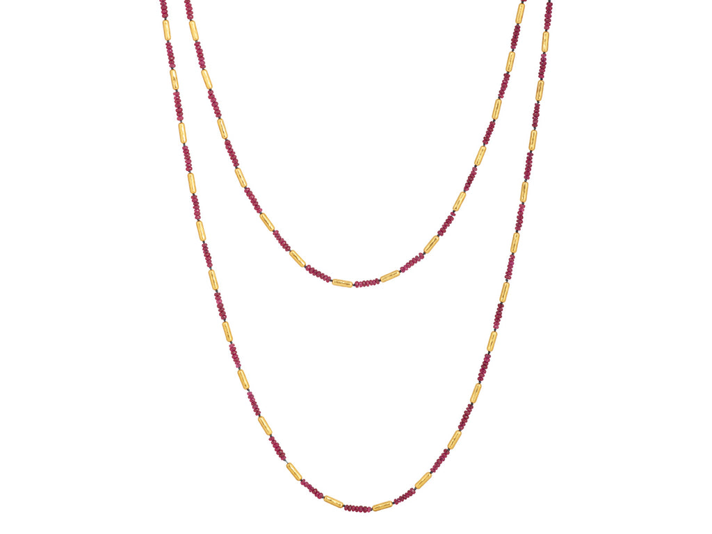 GURHAN Vertigo Gold Ruby Single-Strand Beaded Long Necklace, Thin Gold Tubes with Stone Clusters